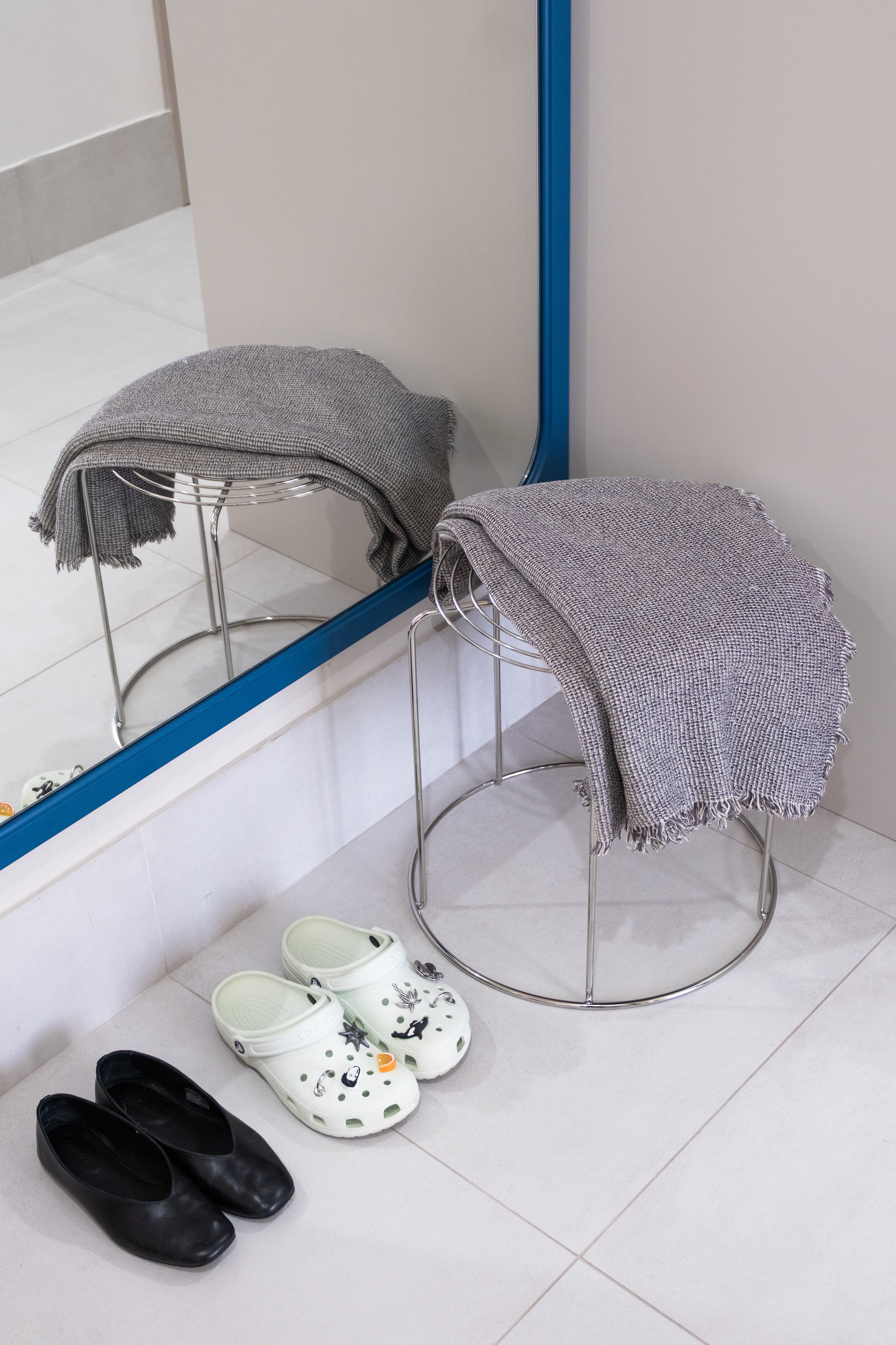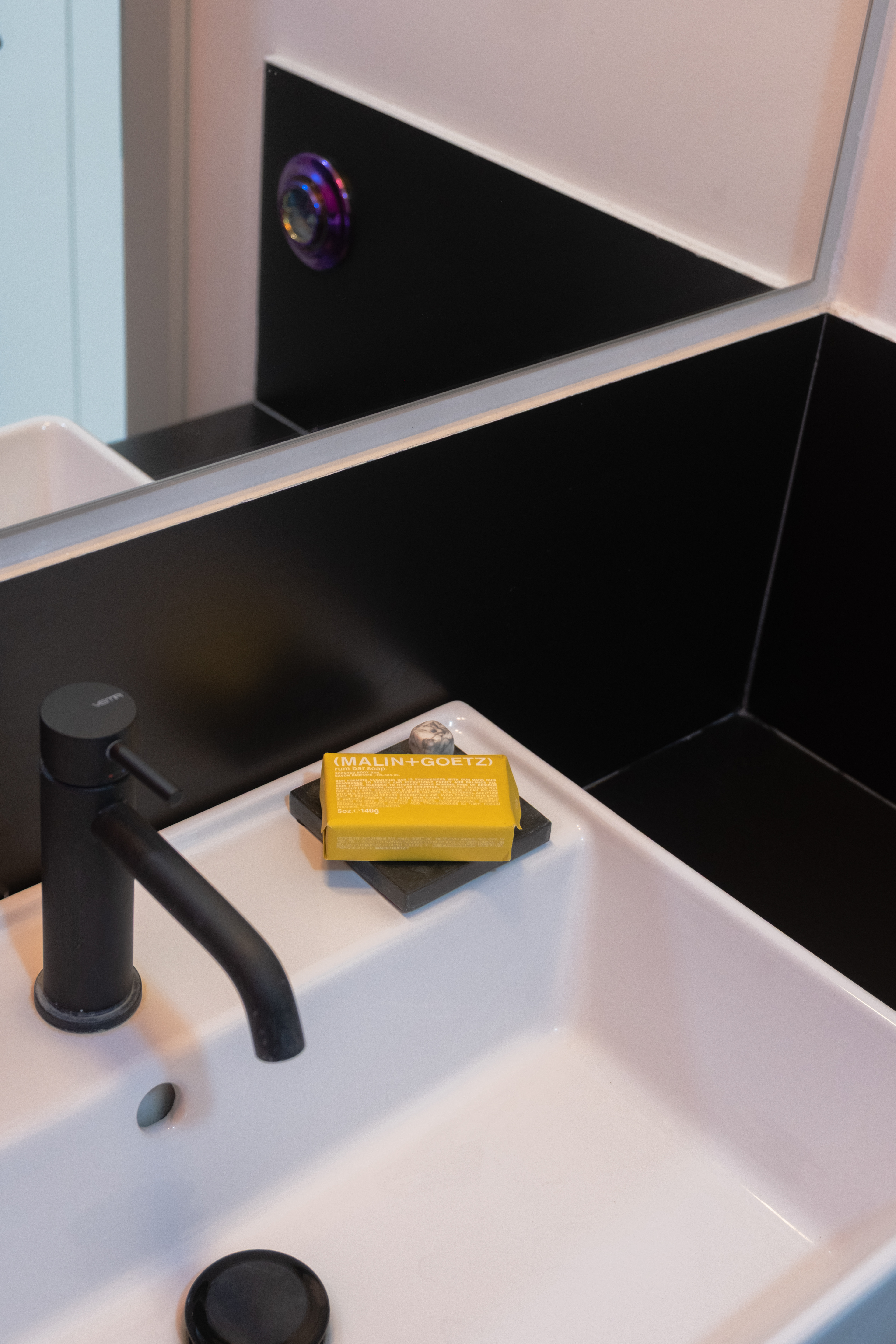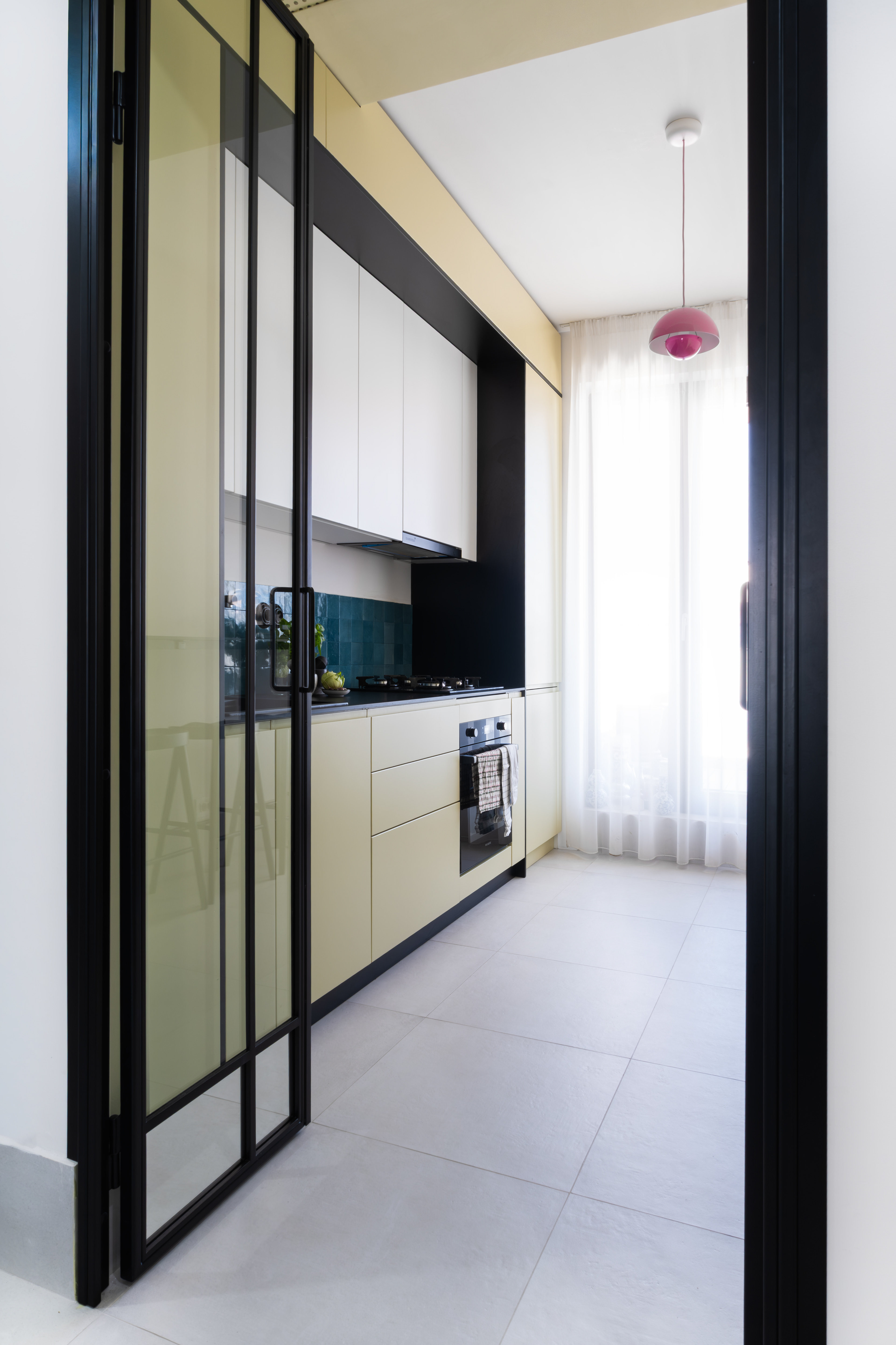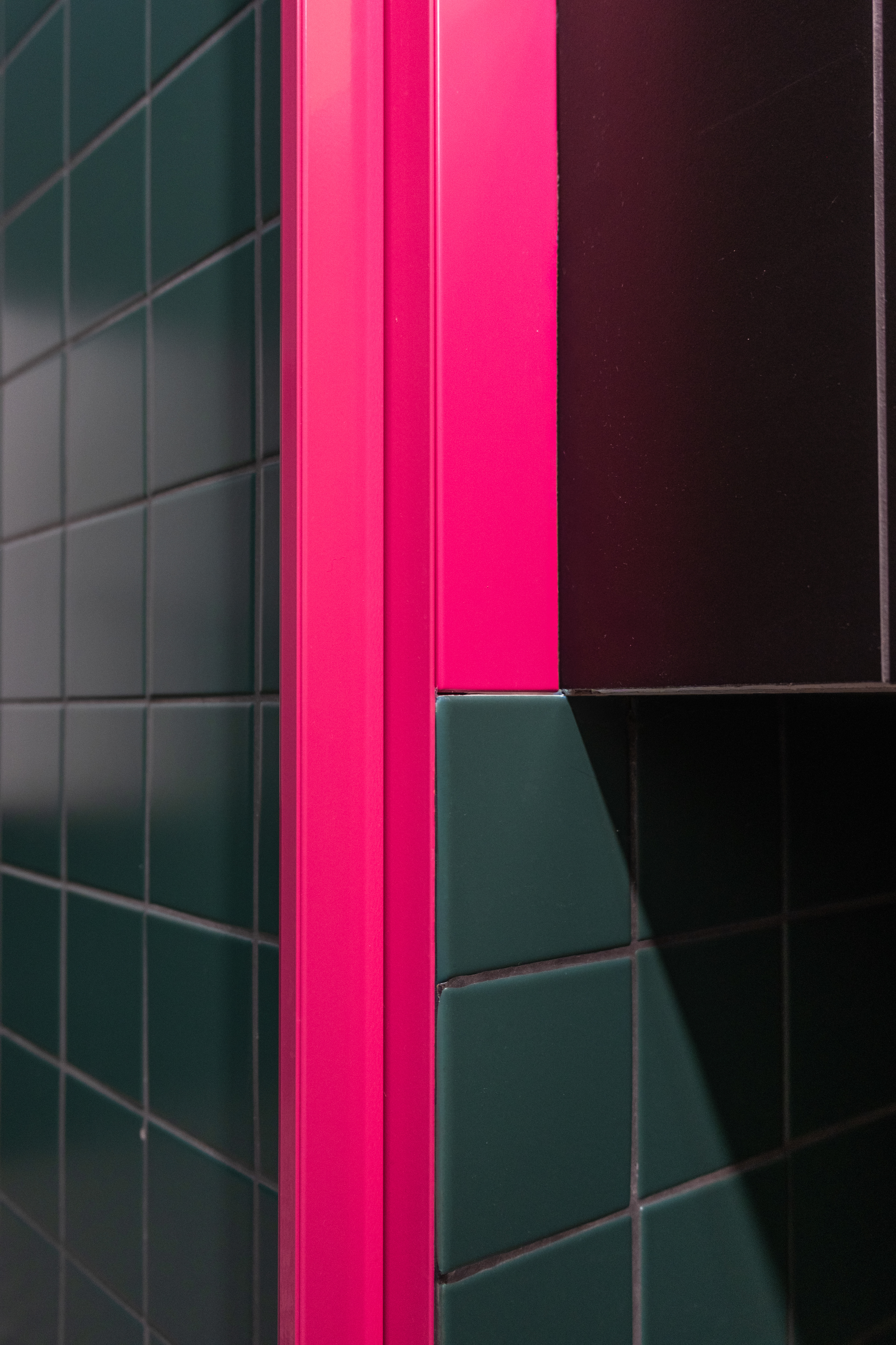 In contrast to the studio’s initial approach – linearity, simplicity, visual continuity – the client, a young graduate with a strong affinity for art, envisioned a less conventional dialogue of materials, shapes, and colors. Thus, among other things, the shades of green, pink, and blue emerge throughout the apartment, sometimes receding, sometimes filling the space, depending on their placement.