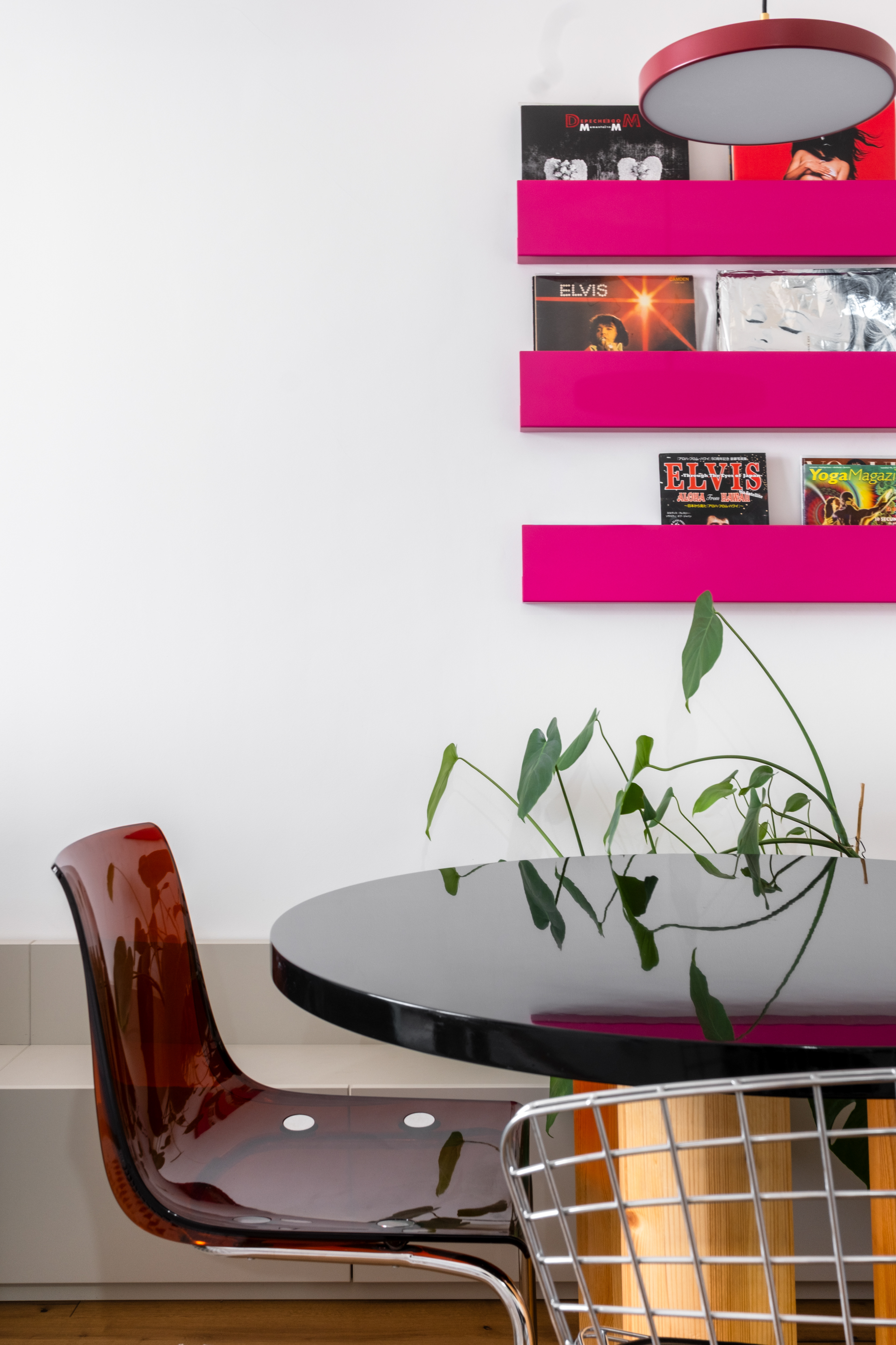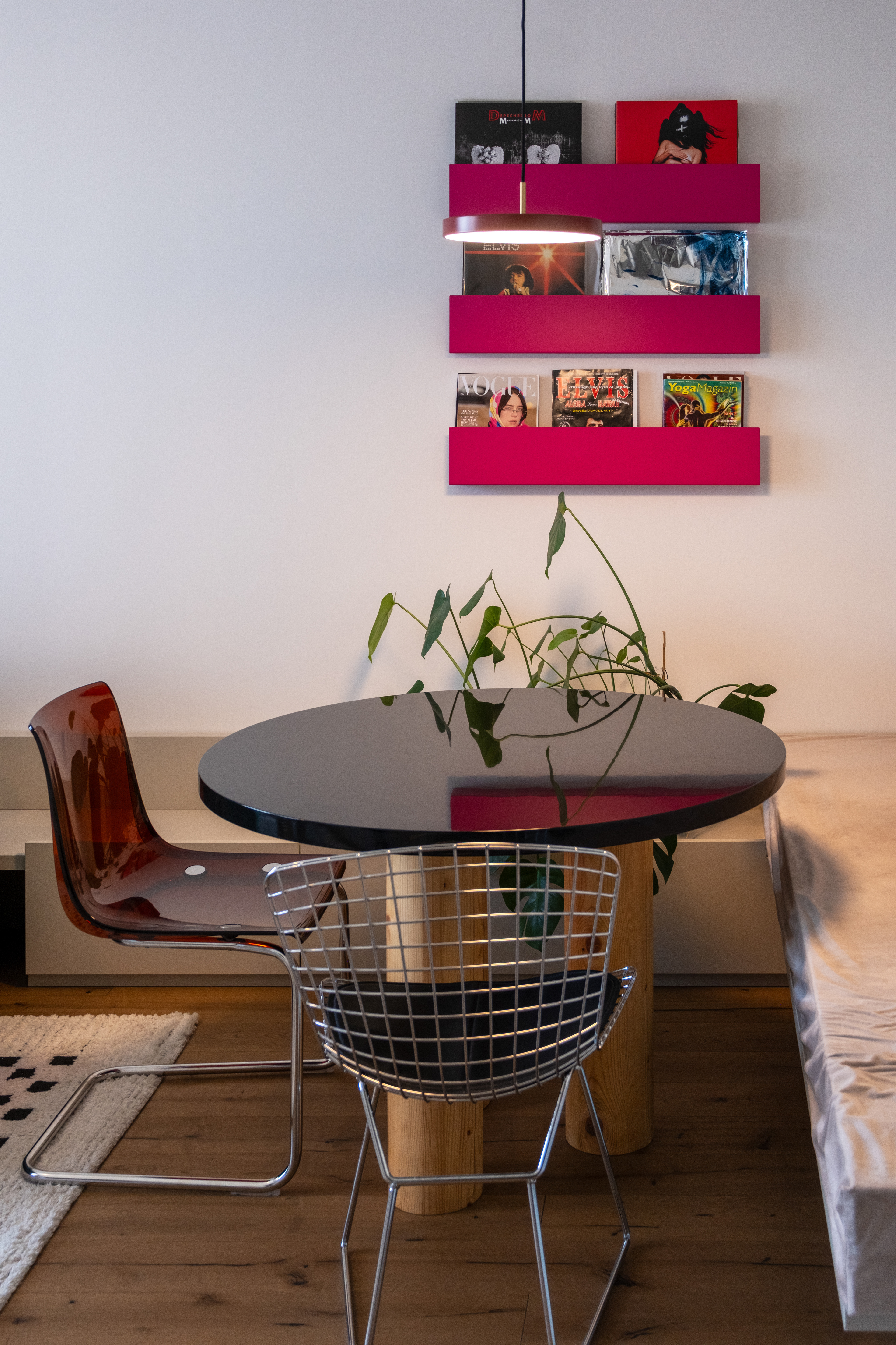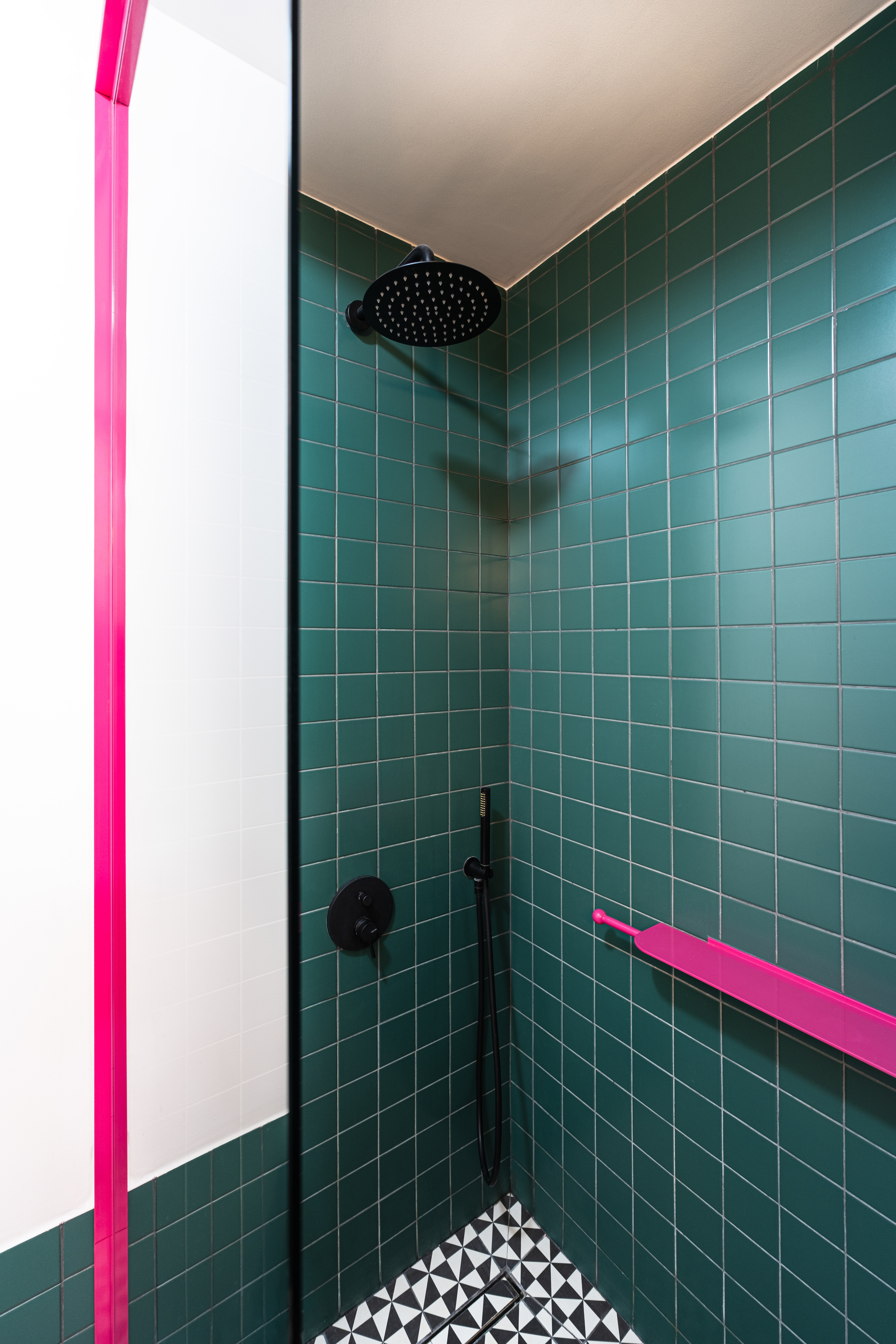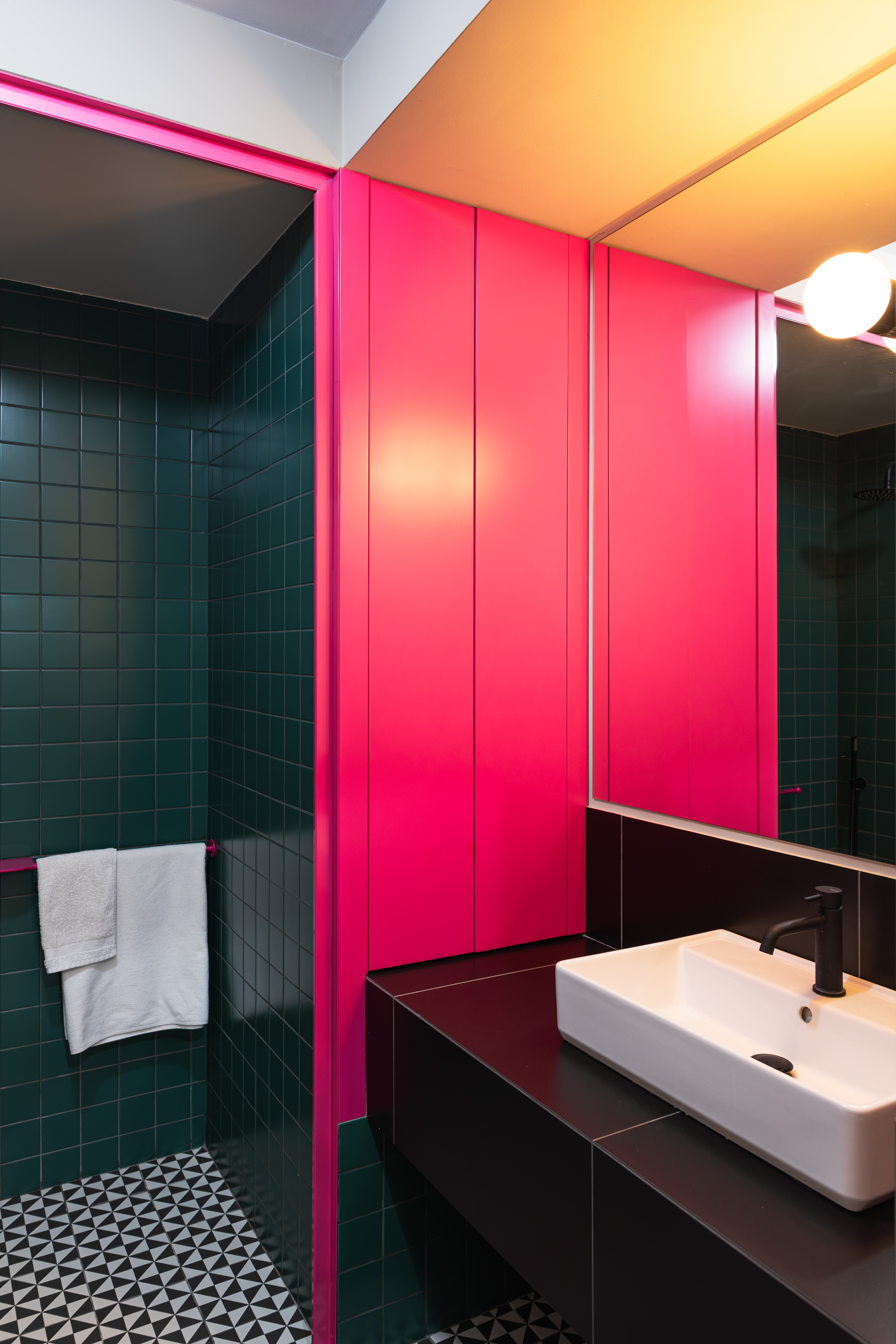 The essence of the project lies in this precise calibration between form and color, between object and space. From the entrance, the apartment opens towards the living area – a generous space that naturally integrates the dining zone while connecting directly to the kitchen. Conceived as a glazed partition, the passage to the cooking area was deliberately widened to enable transparent and fluid communication between rooms, while still offering the possibility of complete openness. Further on, an intermediate hallway leads to the more private area of the house – the bathroom and bedroom. The bathroom, initially defined by a complex geometry, now unfolds into two „pockets” carefully designed for the shower and washbasin. In this room, the two dominant colors of the interior – green and pink – assert themselves boldly, in contrast with the white walls. The entrance to the wet area, the shower cabin, is framed by a “portal” element that follows the line of pink. The bedroom, placed at the far end of the apartment, becomes the quietest retreat. Wrapped in a warm shade of white, the room is furnished to free its center, with the bed integrated into a wooden platform conceived as a natural extension of the windowsill.
