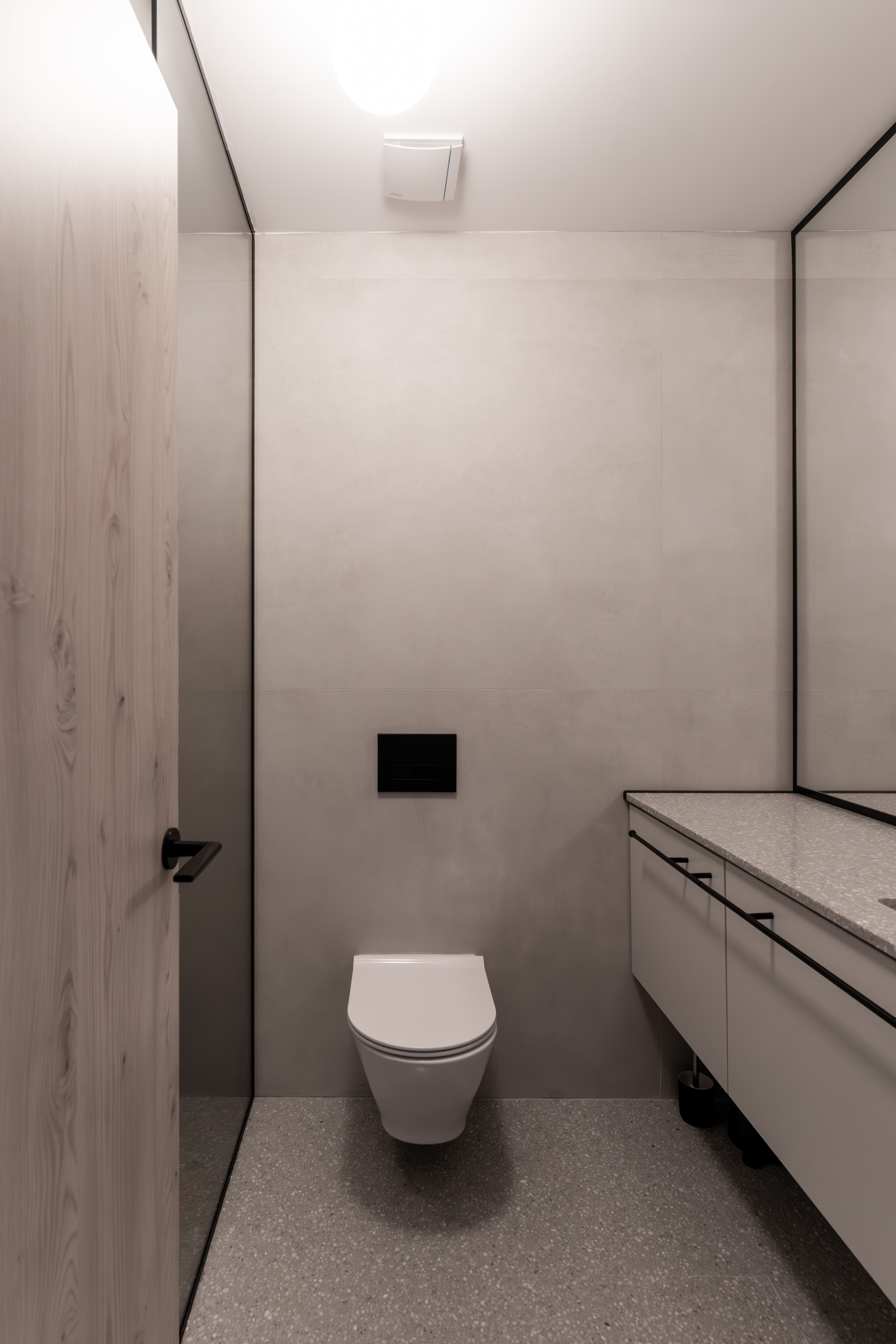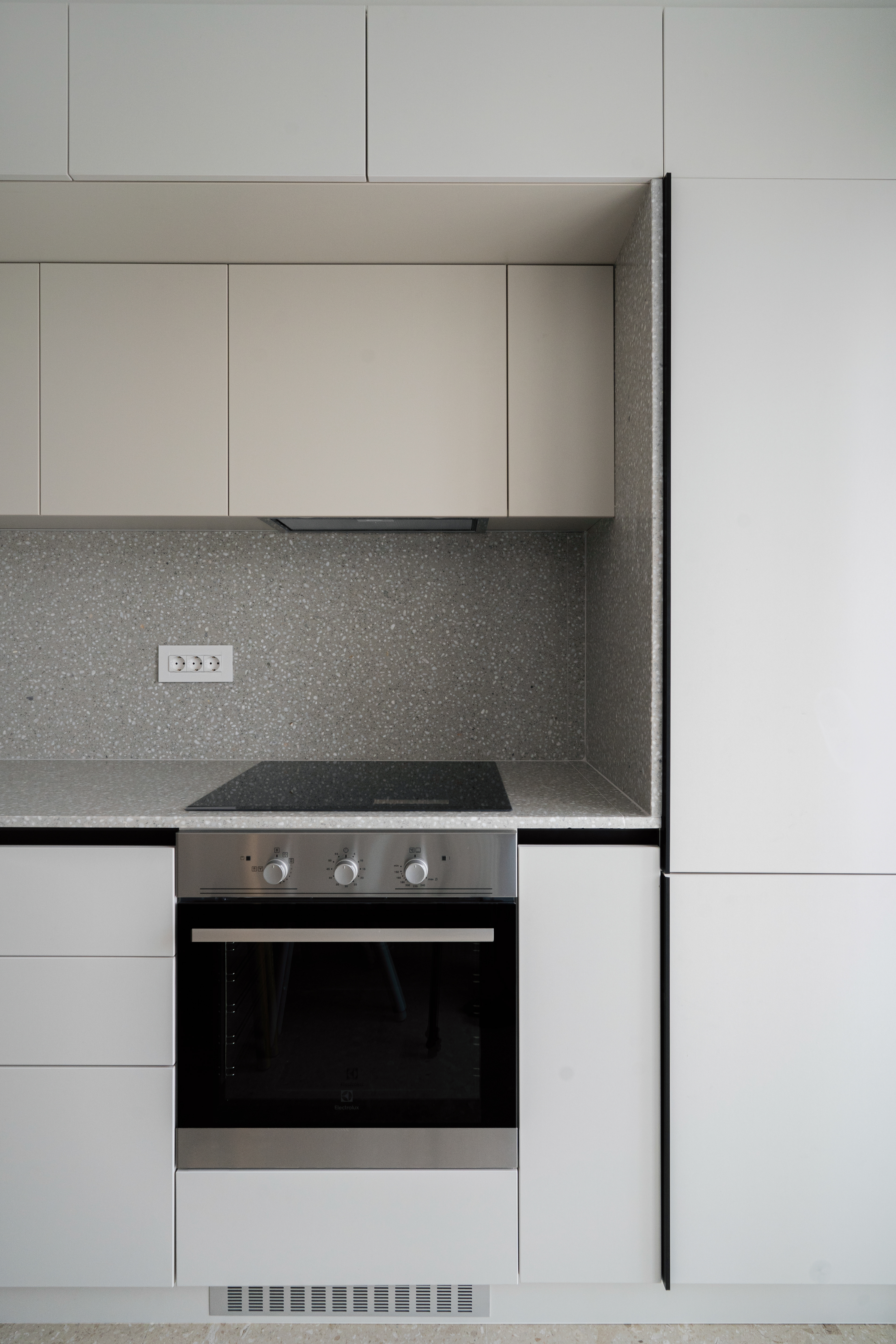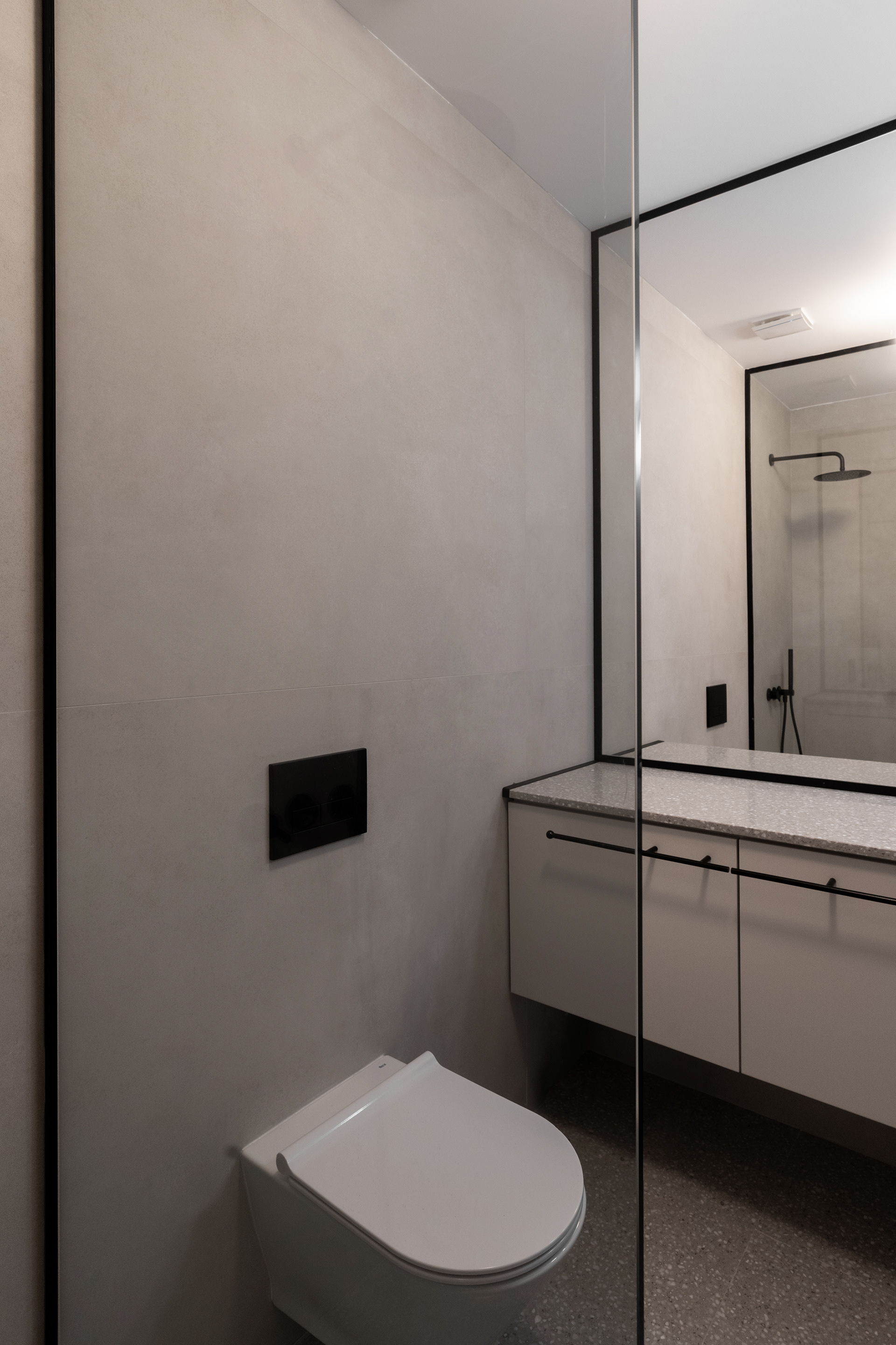 The project on Foisorului street calls into question a relatively simple two-rooms apartment. Starting from a white and gray base, the space is gradually enriched by the wood’s warmth and texture – beginning with a few inserts in the living area, to this veneered "monolith" in the night area. Closely related to simplicity and "as little as possible", the two-room apartment serves a young person who sometimes works from home. Limiting ourselves to the strict necessities, we came to this final proposal which not only visually hides each and every existing storage area, but also chooses to subtly mark this minimum need for living. On the one hand, we have a day-living area that, instead of "hiding" and limiting the working desk, positions it as part of the furniture open to the common space. On the other hand, we have the transition from the day area to the night area which we chose to mark with a so-called "portal". Once covered with veneer, this transition becomes much more intimate, with a particular nuance. In addition to the walls cladding, there is also the mirror that brings a necessary depth to a small space - like this hallway - and has an important functional role. The color and texture of the chosen materials, whether in the kitchen and living-room or in the bedroom or bathroom, define the spaces and allow us to notice the different elements of the project, whether they are structural, functional or purely ornamental.