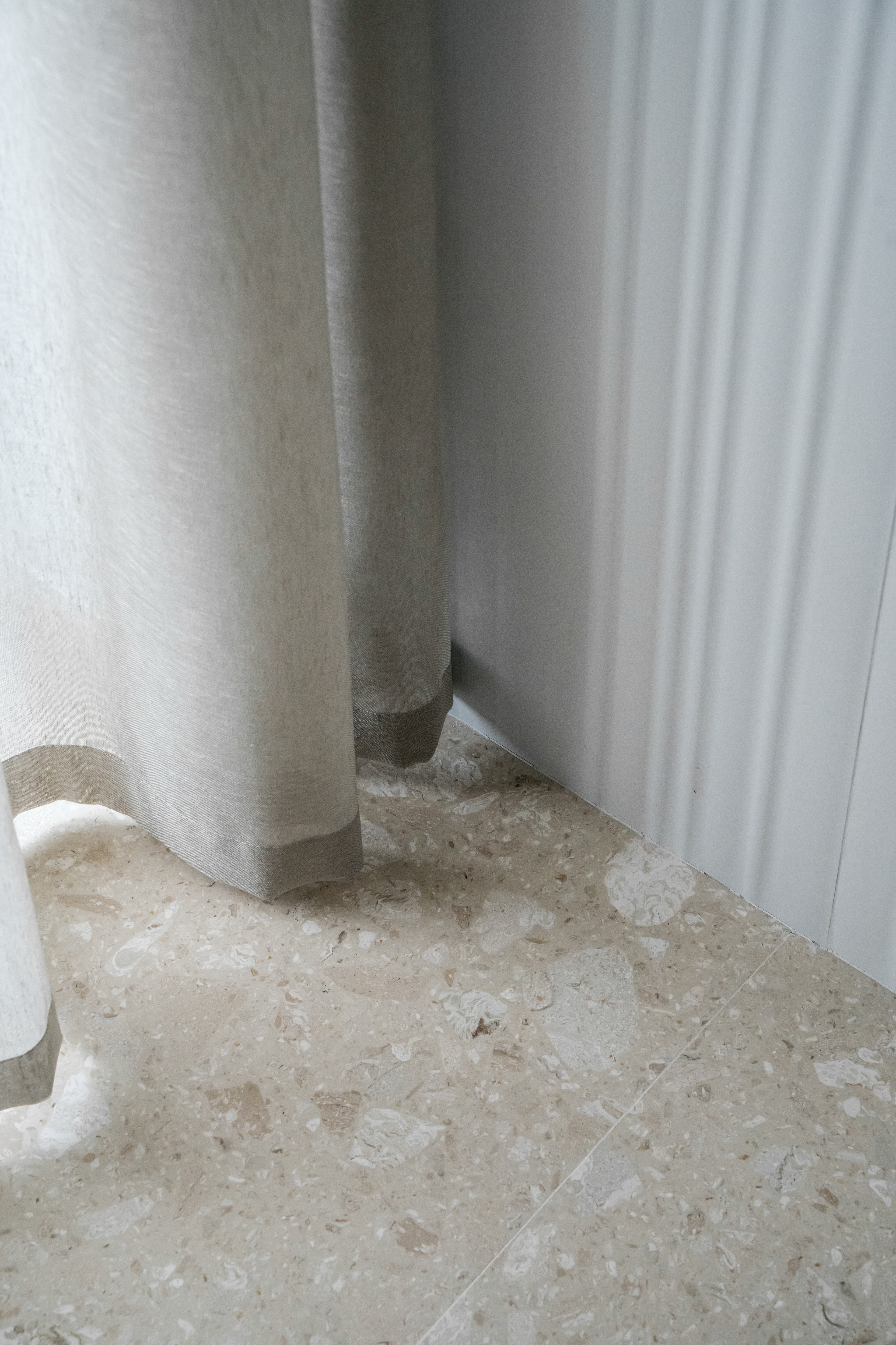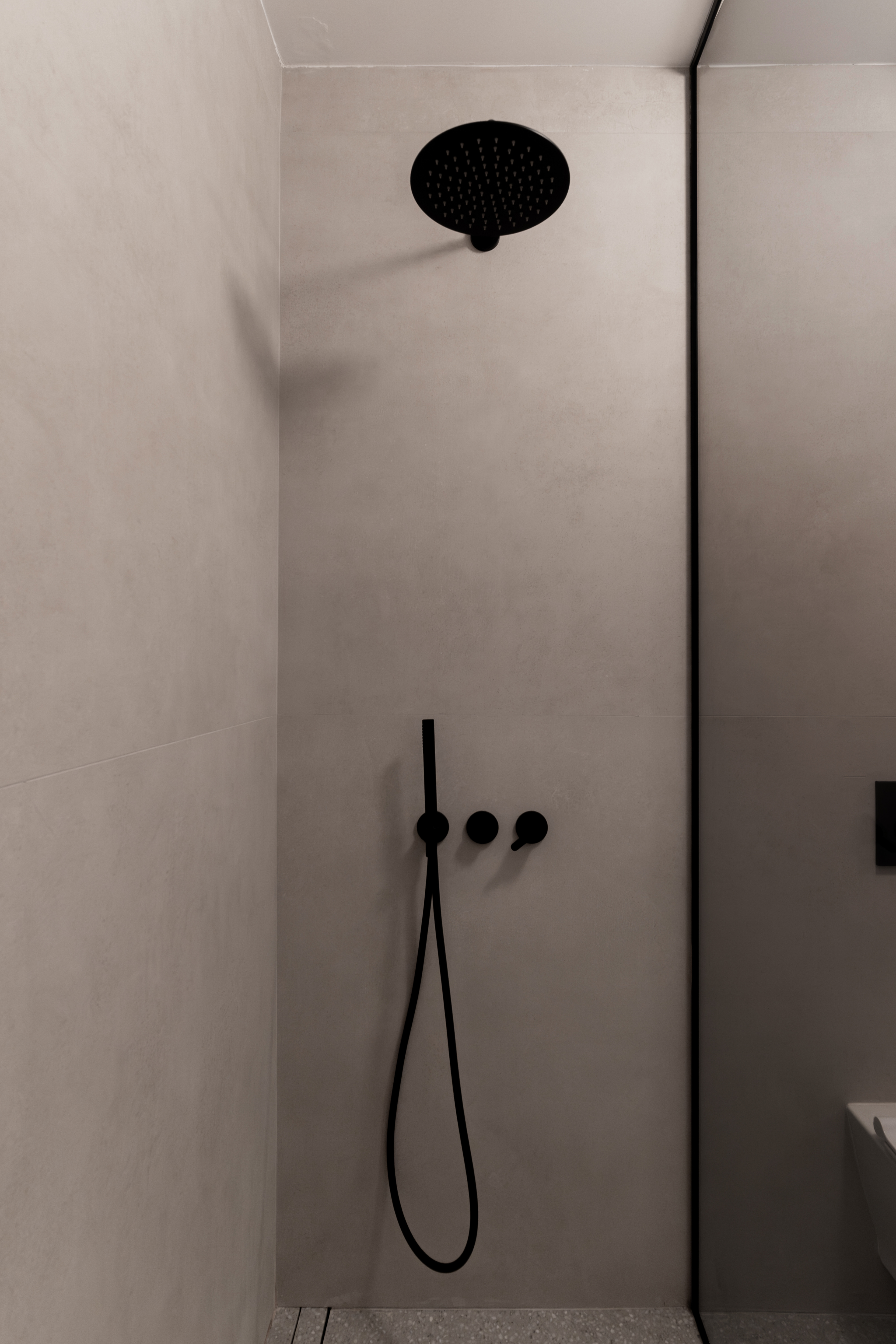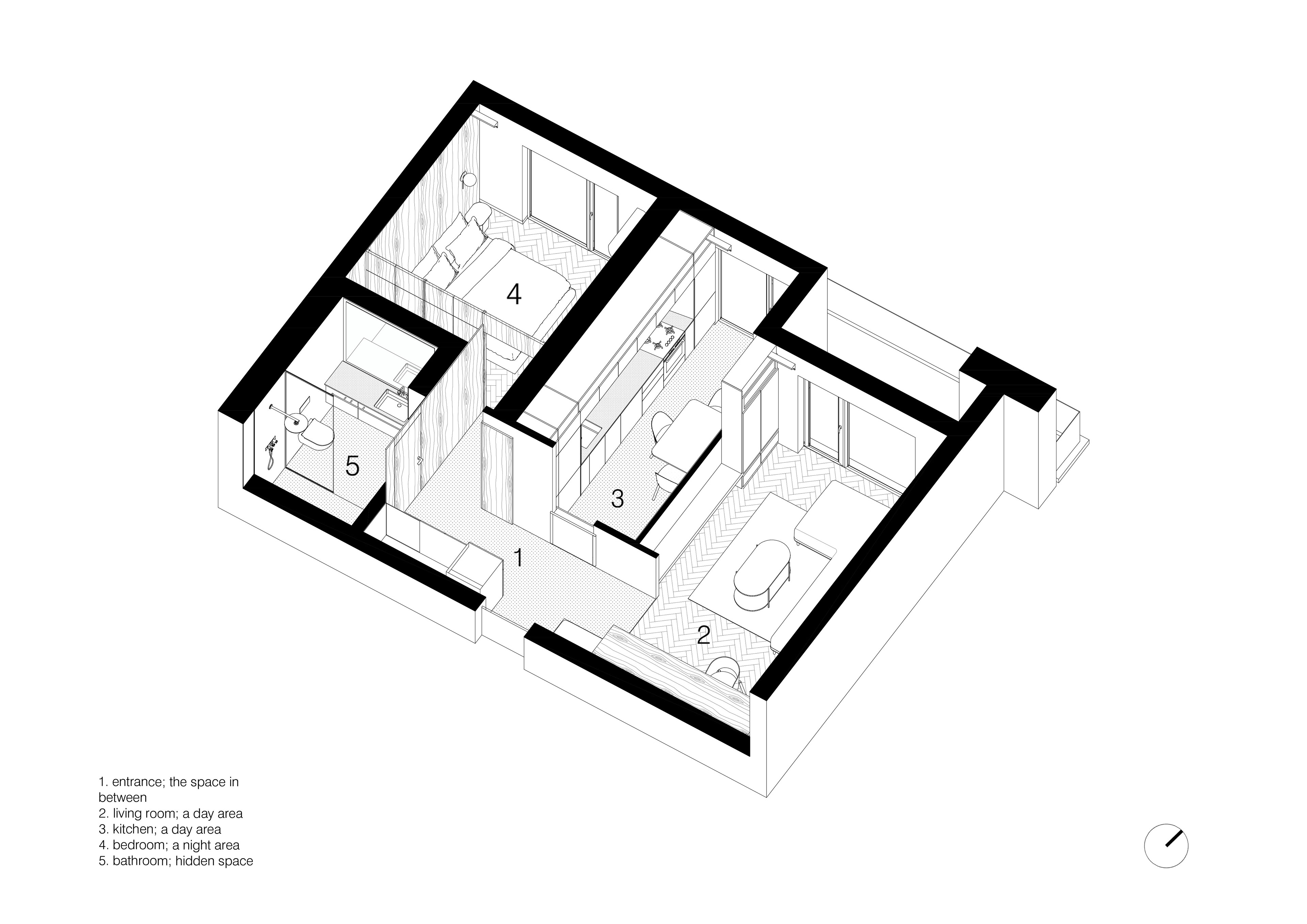 The project on Foisorului street calls into question a relatively simple two-rooms apartment. Starting from a white and gray base, the space is gradually enriched by the wood’s warmth and texture – beginning with a few inserts in the living area, to this veneered "monolith" in the night area. Closely related to simplicity and "as little as possible", the two-room apartment serves a young person who sometimes works from home. Limiting ourselves to the strict necessities, we came to this final proposal which not only visually hides each and every existing storage area, but also chooses to subtly mark this minimum need for living. On the one hand, we have a day-living area that, instead of "hiding" and limiting the working desk, positions it as part of the furniture open to the common space. On the other hand, we have the transition from the day area to the night area which we chose to mark with a so-called "portal". Once covered with veneer, this transition becomes much more intimate, with a particular nuance. In addition to the walls cladding, there is also the mirror that brings a necessary depth to a small space - like this hallway - and has an important functional role. The color and texture of the chosen materials, whether in the kitchen and living-room or in the bedroom or bathroom, define the spaces and allow us to notice the different elements of the project, whether they are structural, functional or purely ornamental.