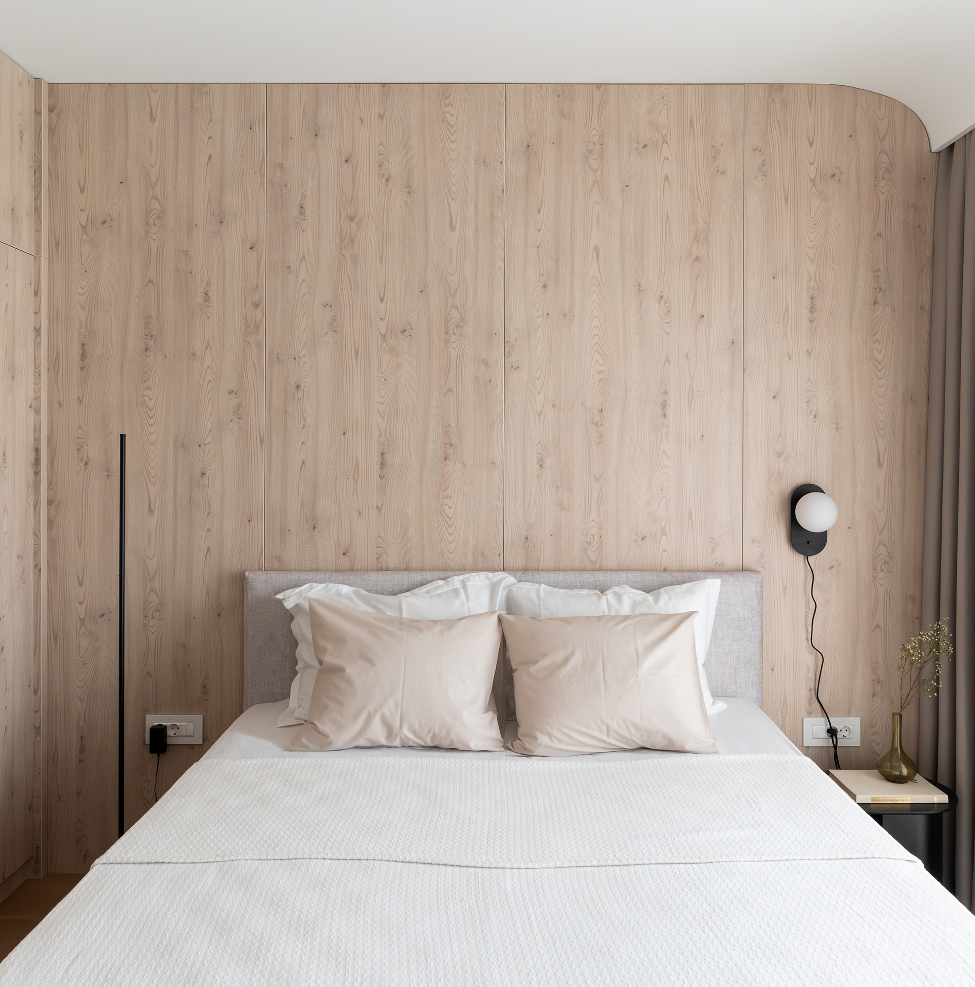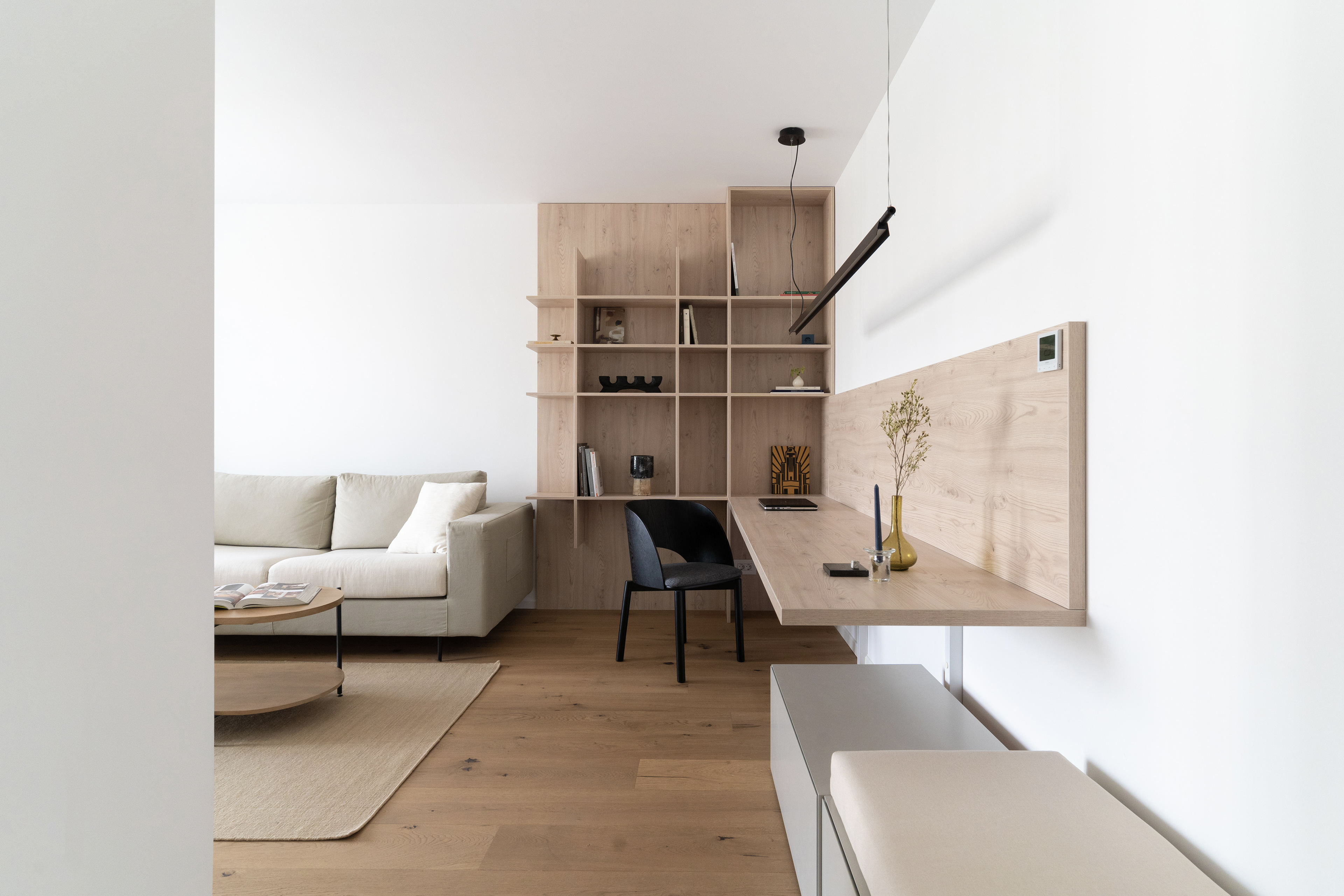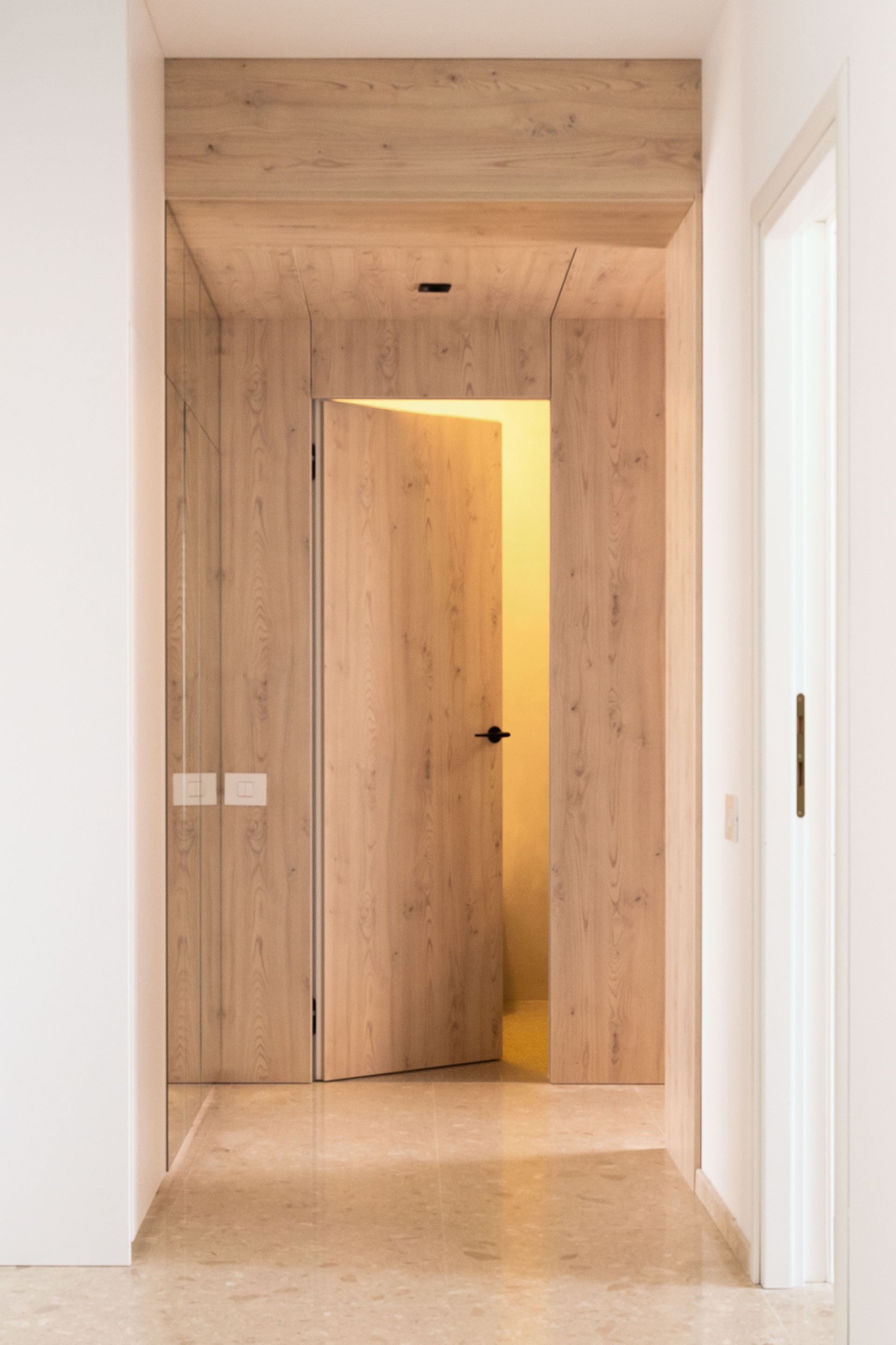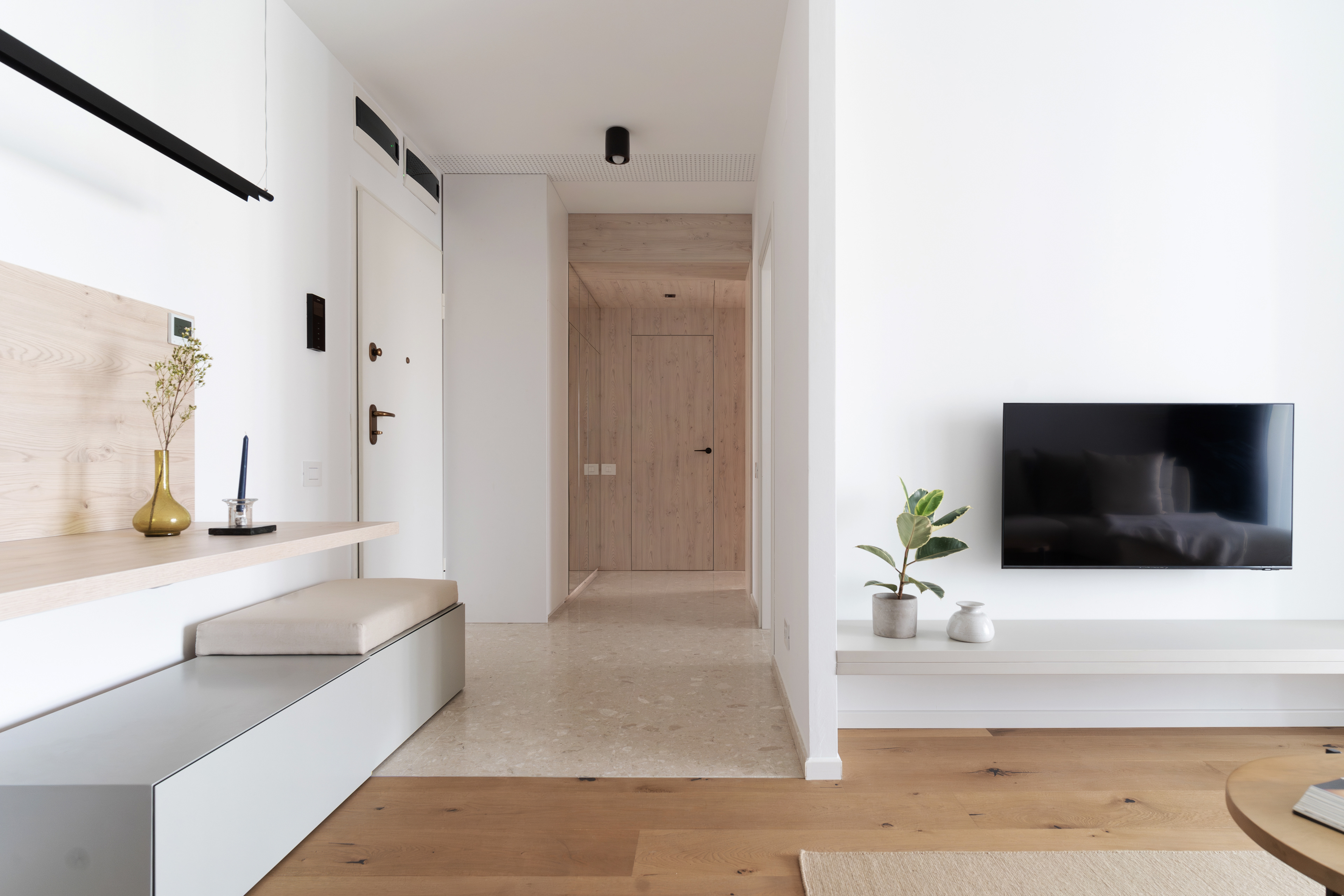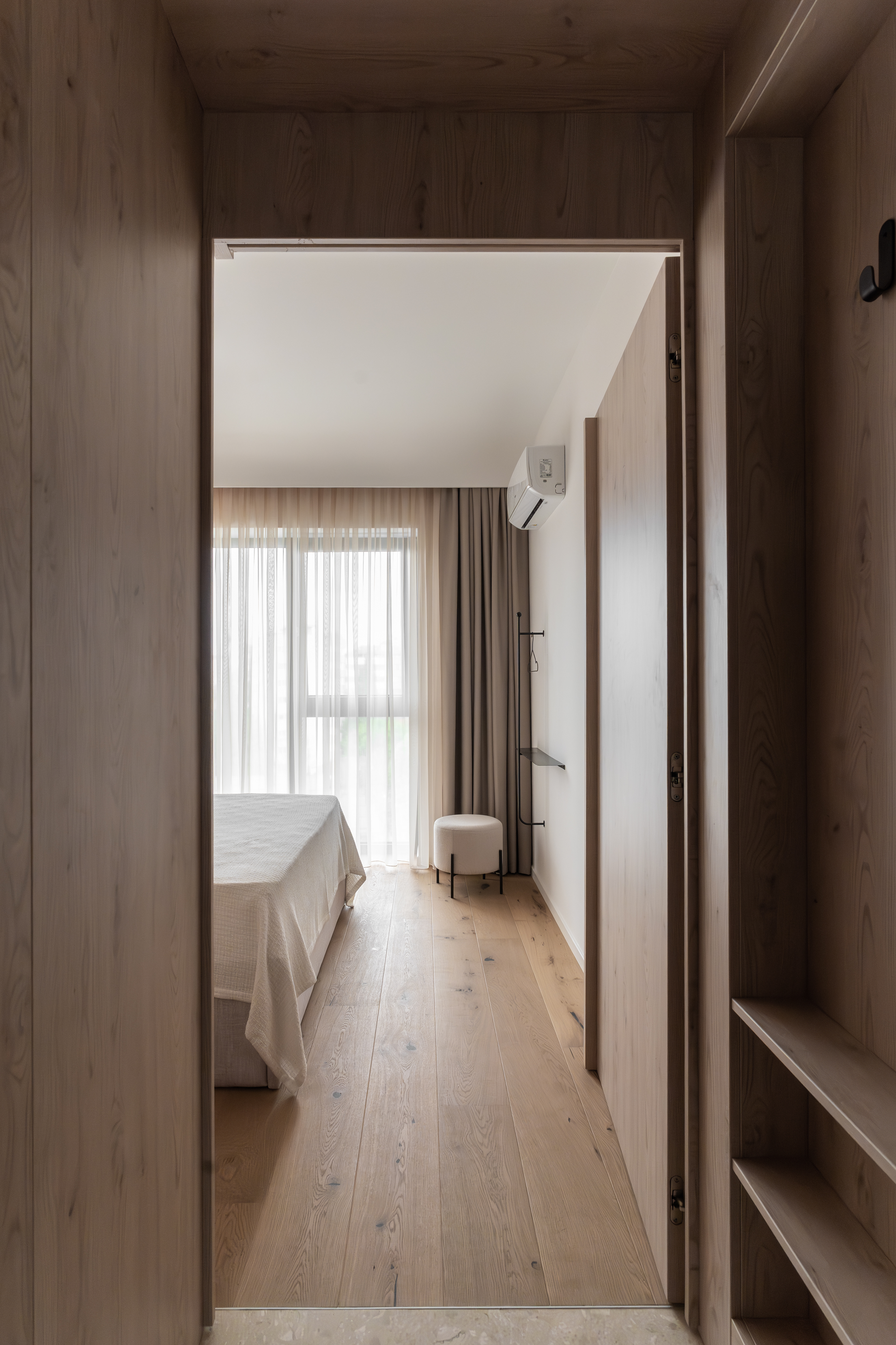 The project on Foișorului street calls into question a relatively simple two-rooms apartment. Starting from a white and gray base, the space is gradually enriched by the wood’s warmth and texture - beginning with a few inserts in the living area, to this veneered "monolith" in the night area.