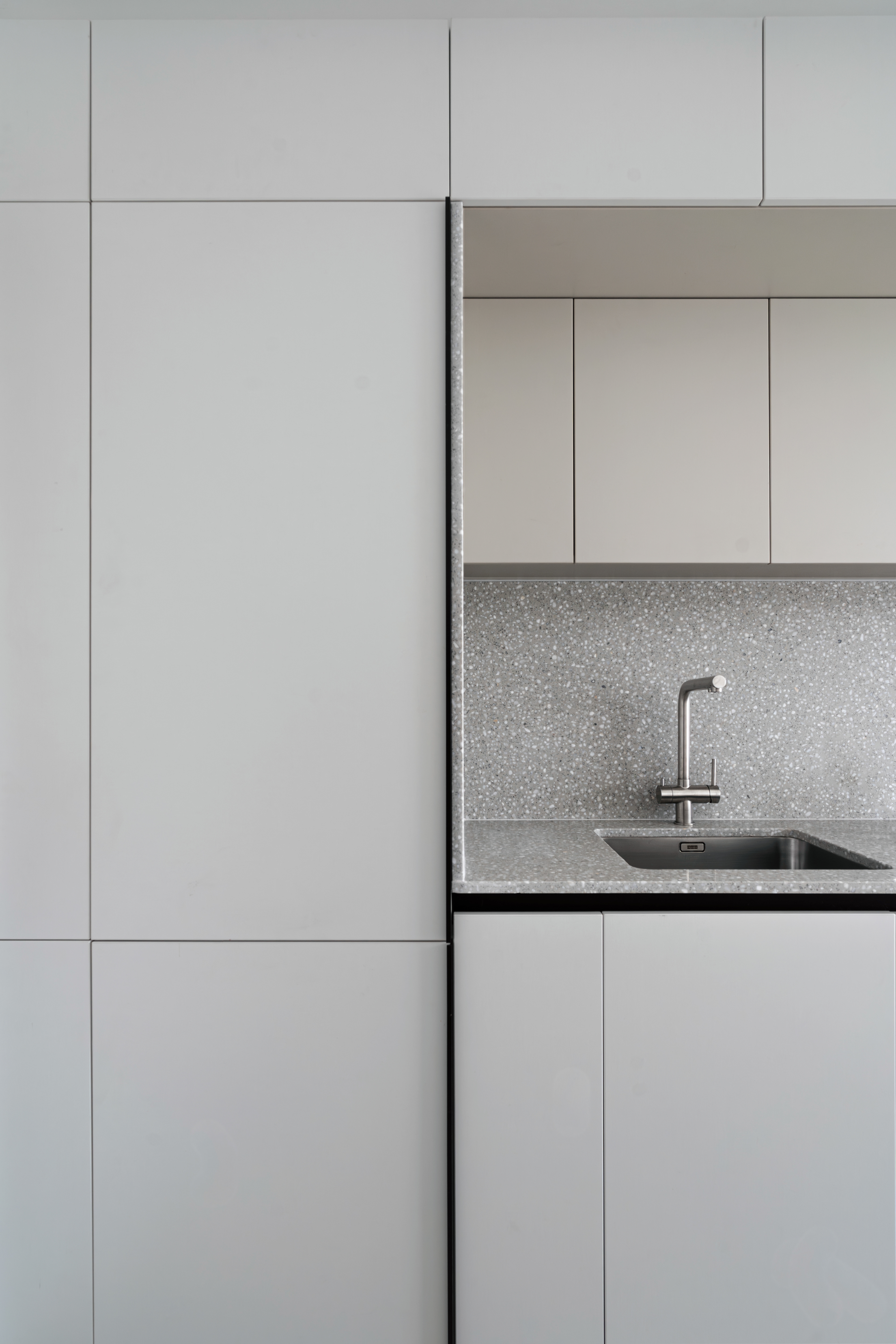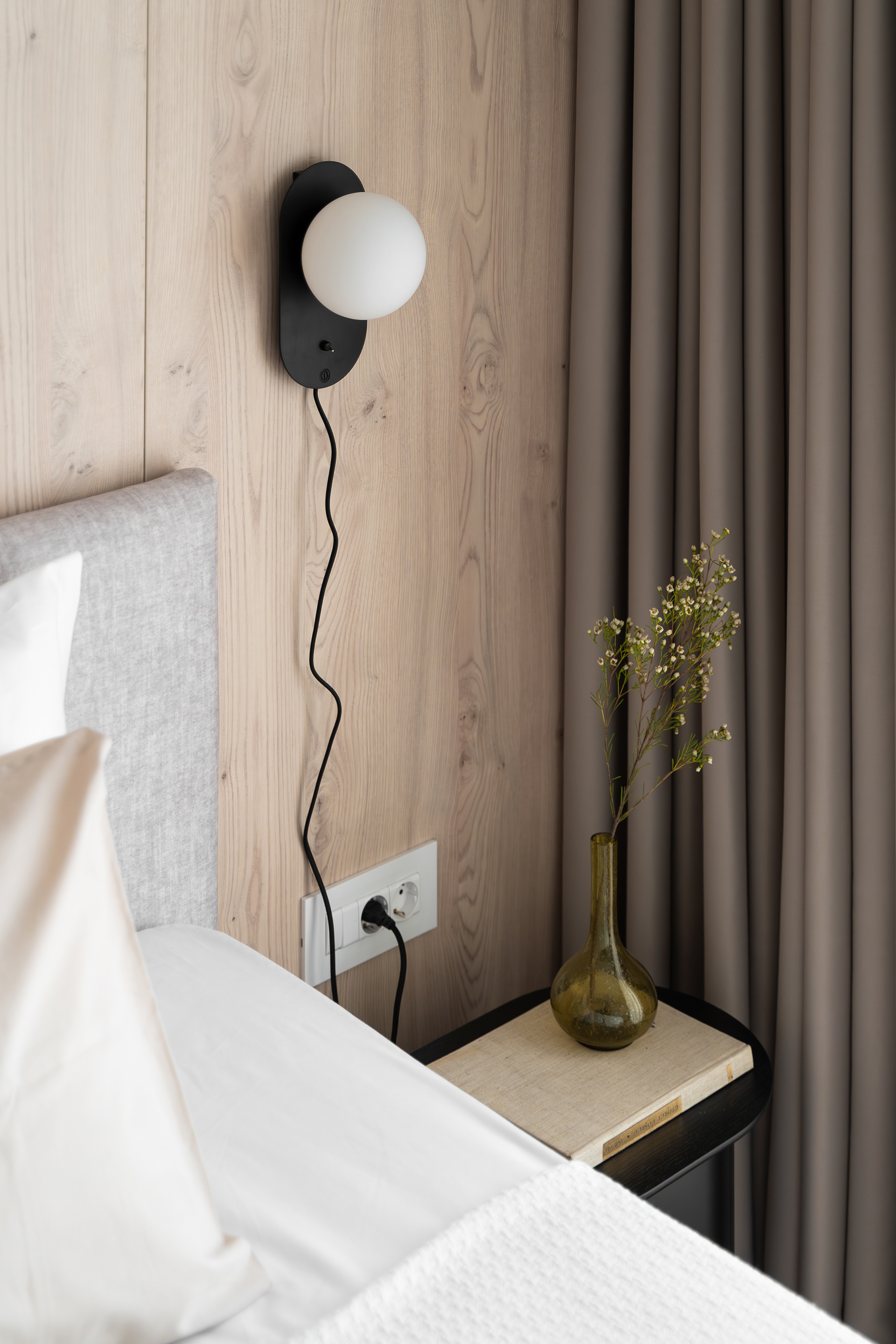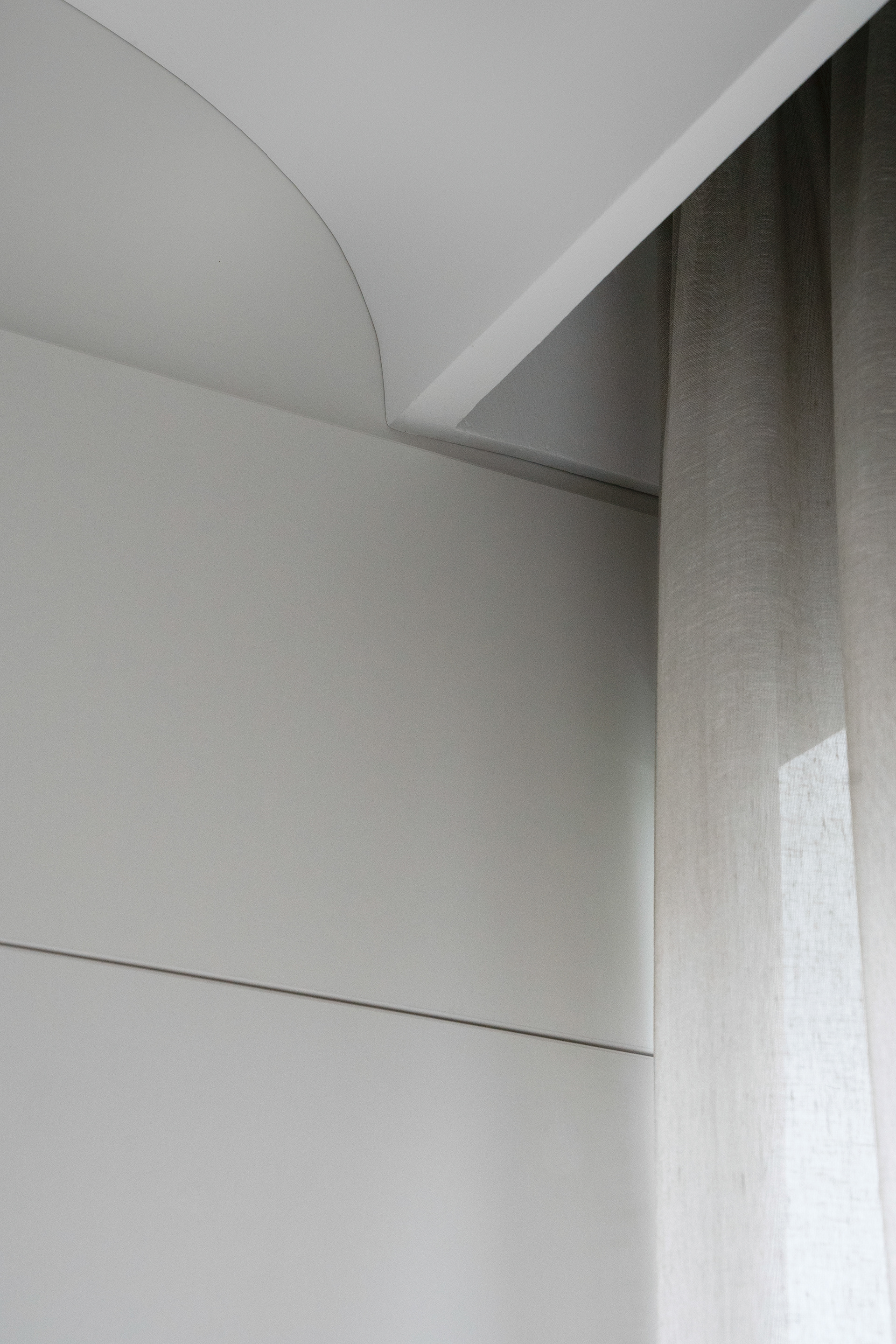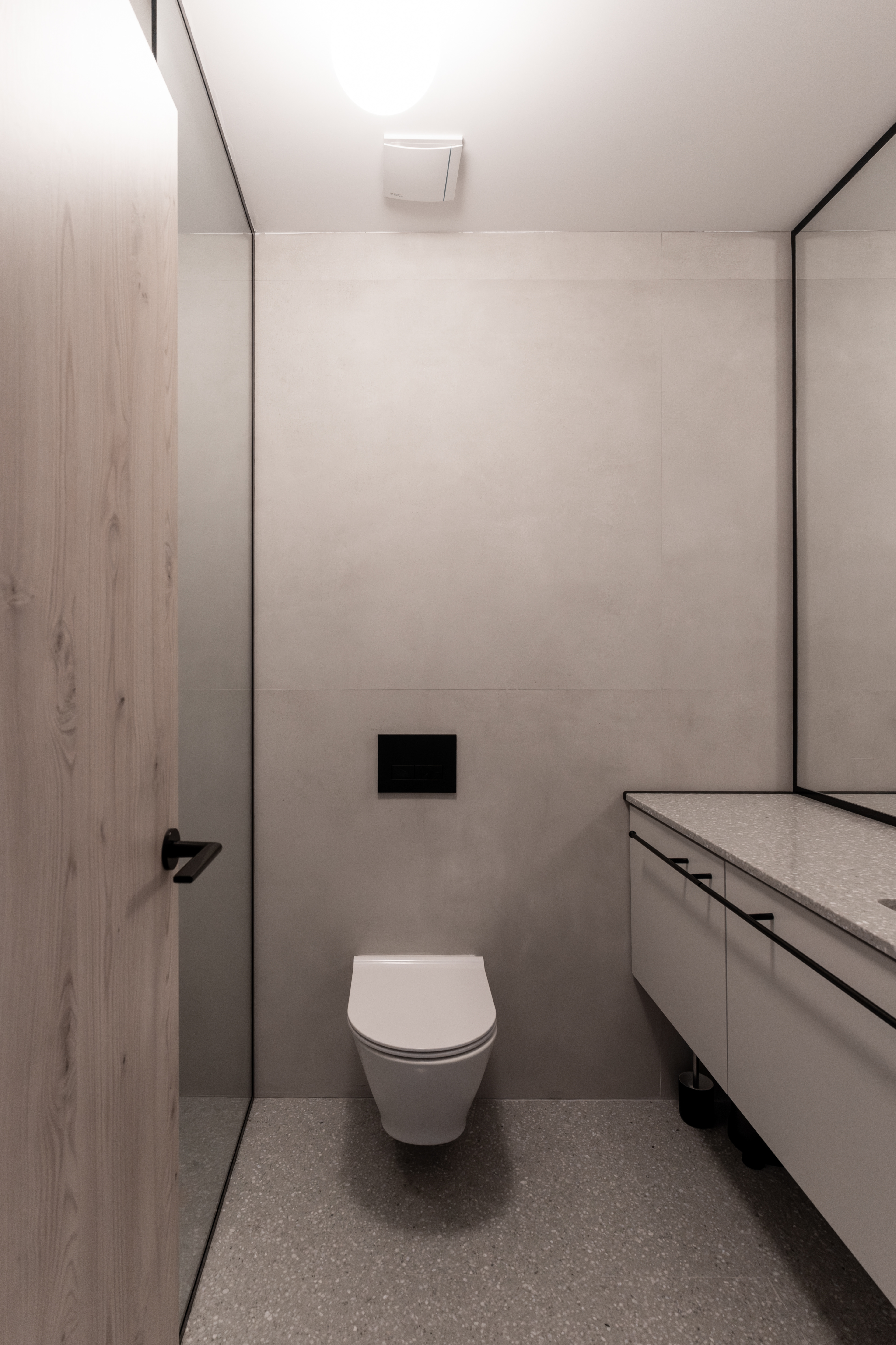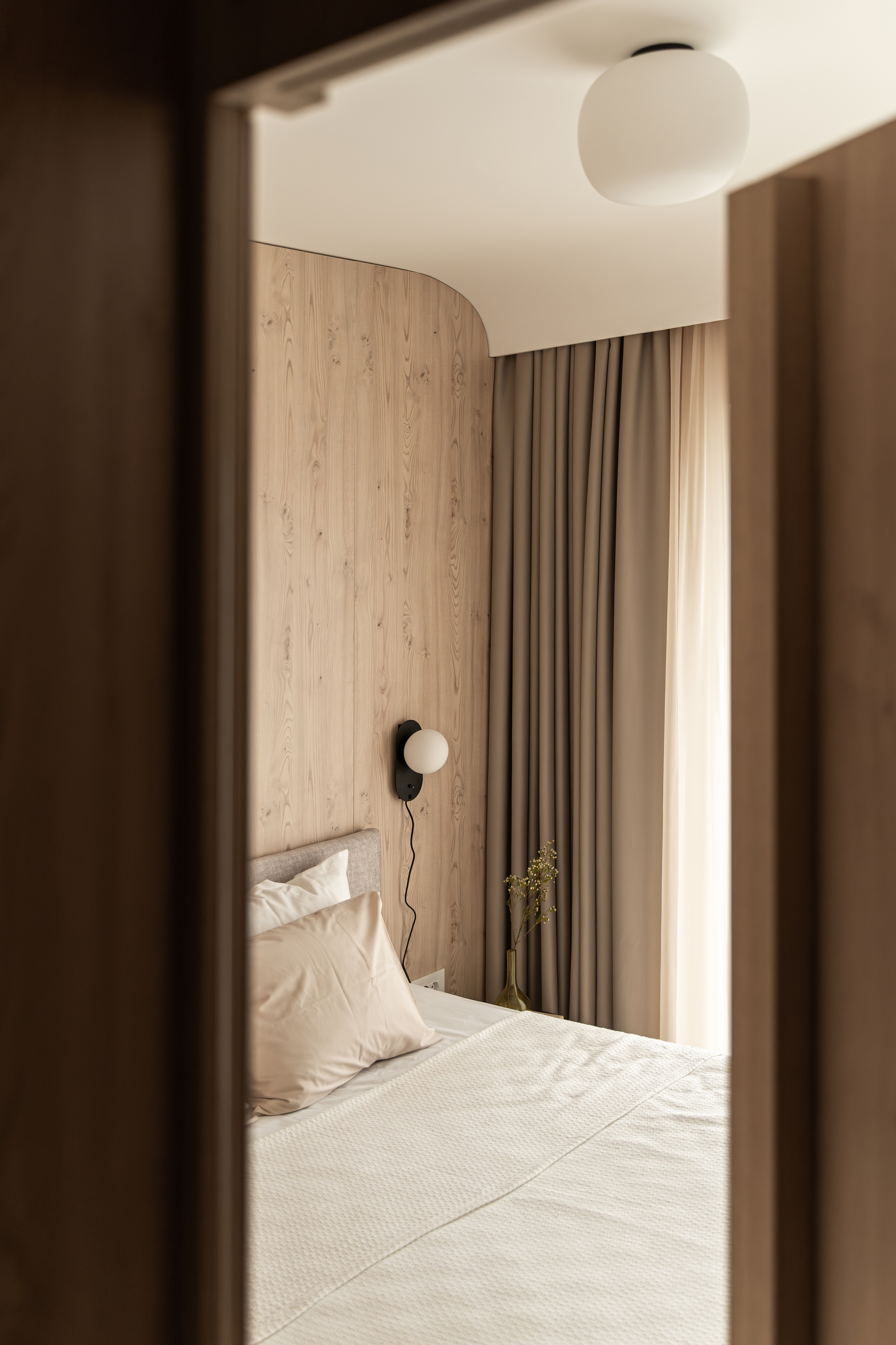 The project on Foișorului street calls into question a relatively simple two-rooms apartment. Starting from a white and gray base, the space is gradually enriched by the wood’s warmth and texture - beginning with a few inserts in the living area, to this veneered "monolith" in the night area.