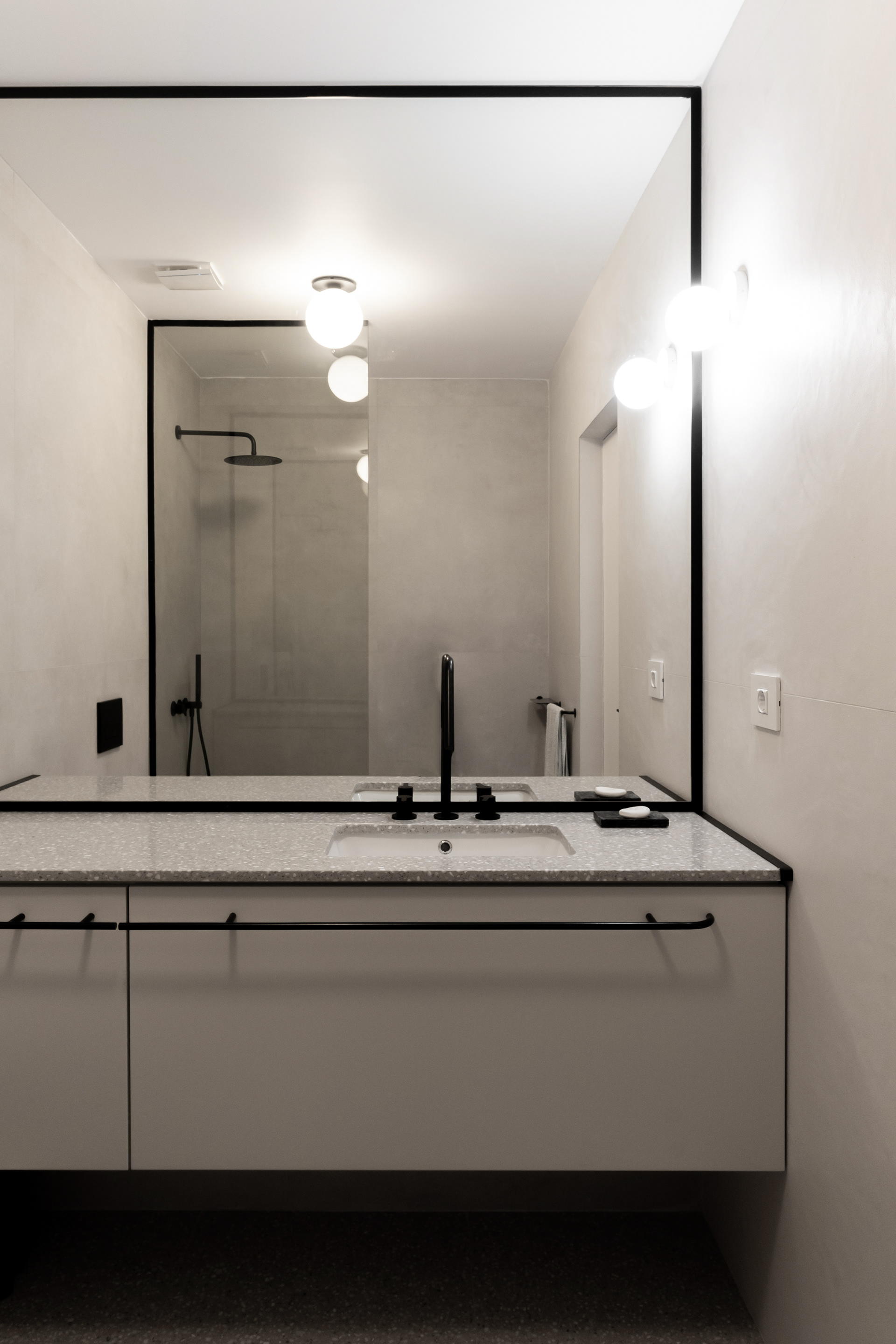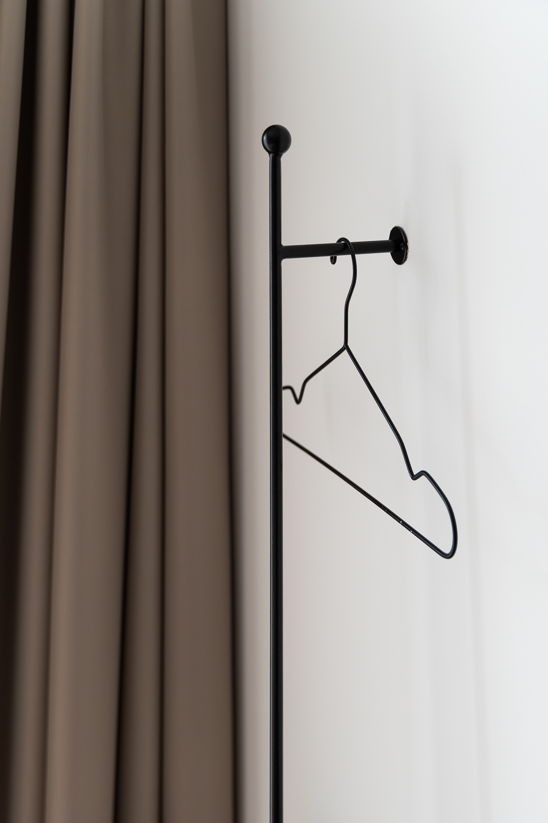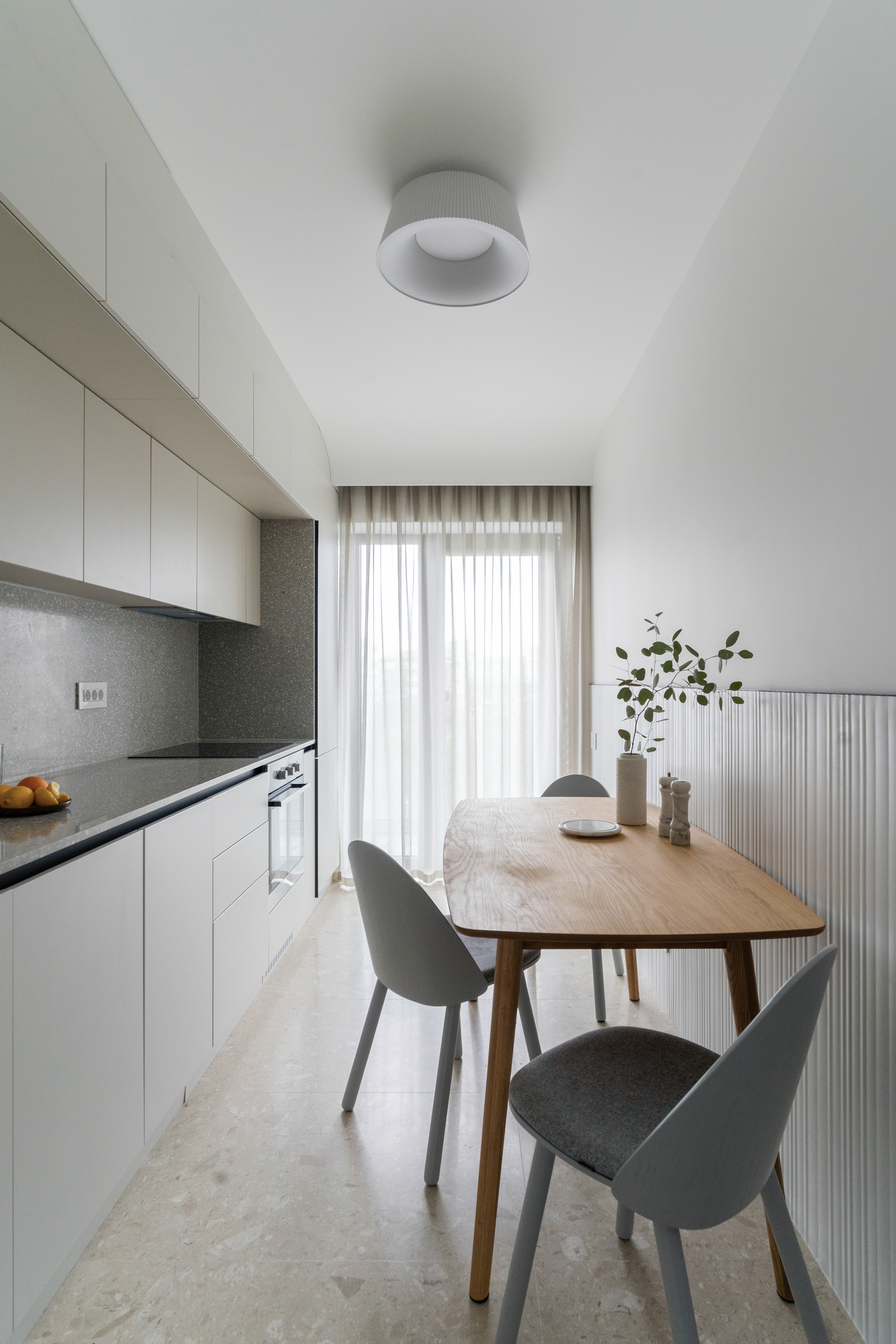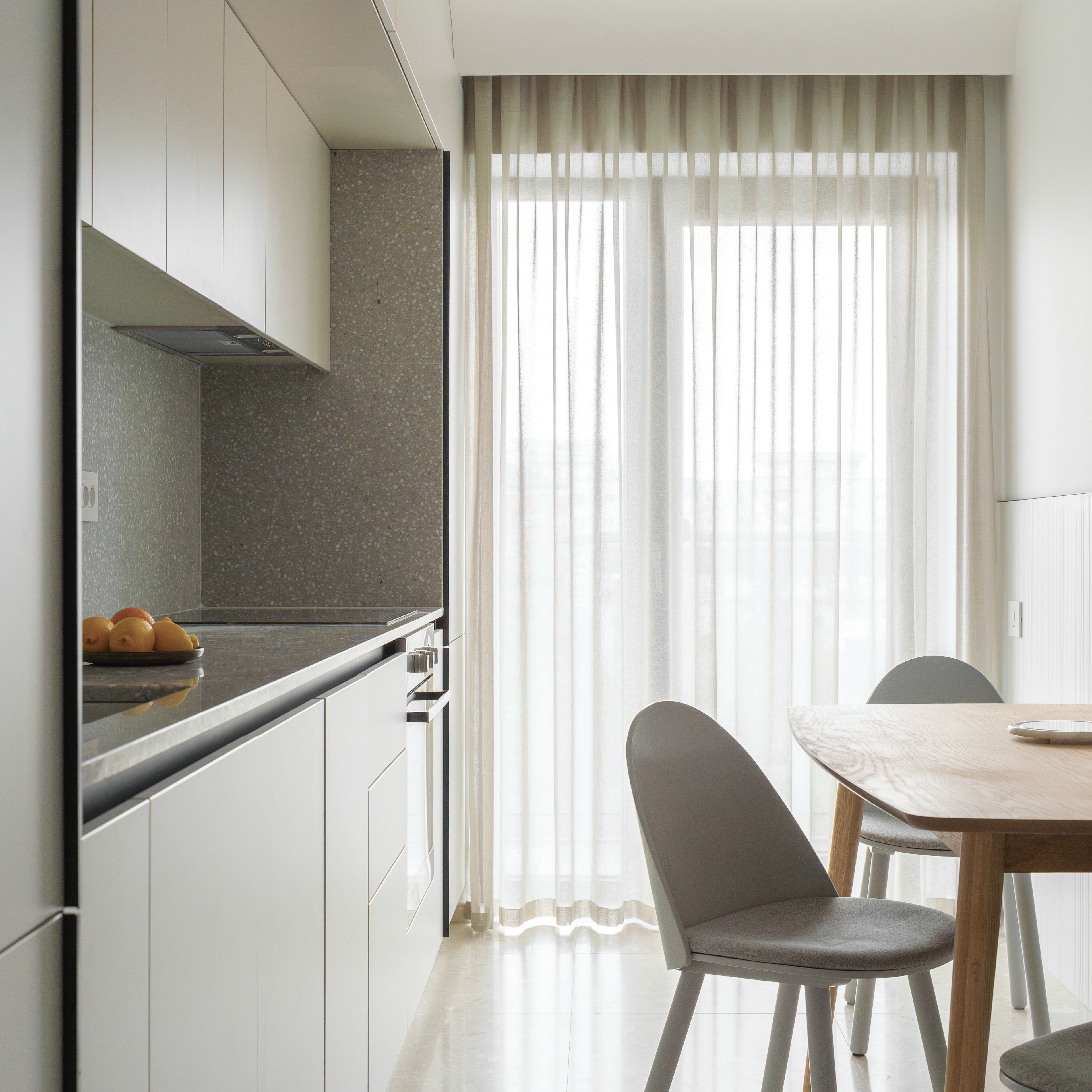 Closely related to simplicity and "as little as possible", the two-room apartment serves a young person who sometimes works from home. Limiting ourselves to the strict necessities, we came to this final proposal which not only visually hides each and every existing storage area, but also chooses to subtly mark this minimum need for living. On the one hand, we have a day-living area that, instead of "hiding" and limiting the working desk, positions it as part of the furniture open to the common space. On the other hand, we have the transition from the day area to the night area which we chose to mark with a so-called "portal". Once covered with veneer, this transition becomes much more intimate, with a particular nuance. In addition to the walls cladding, there is also the mirror that brings a necessary depth to a small space - like this hallway - and has an important functional role. The color and texture of the chosen materials, whether in the kitchen and living-room or in the bedroom or bathroom, define the spaces and allow us to notice the different elements of the project, whether they are structural, functional or purely ornamental.