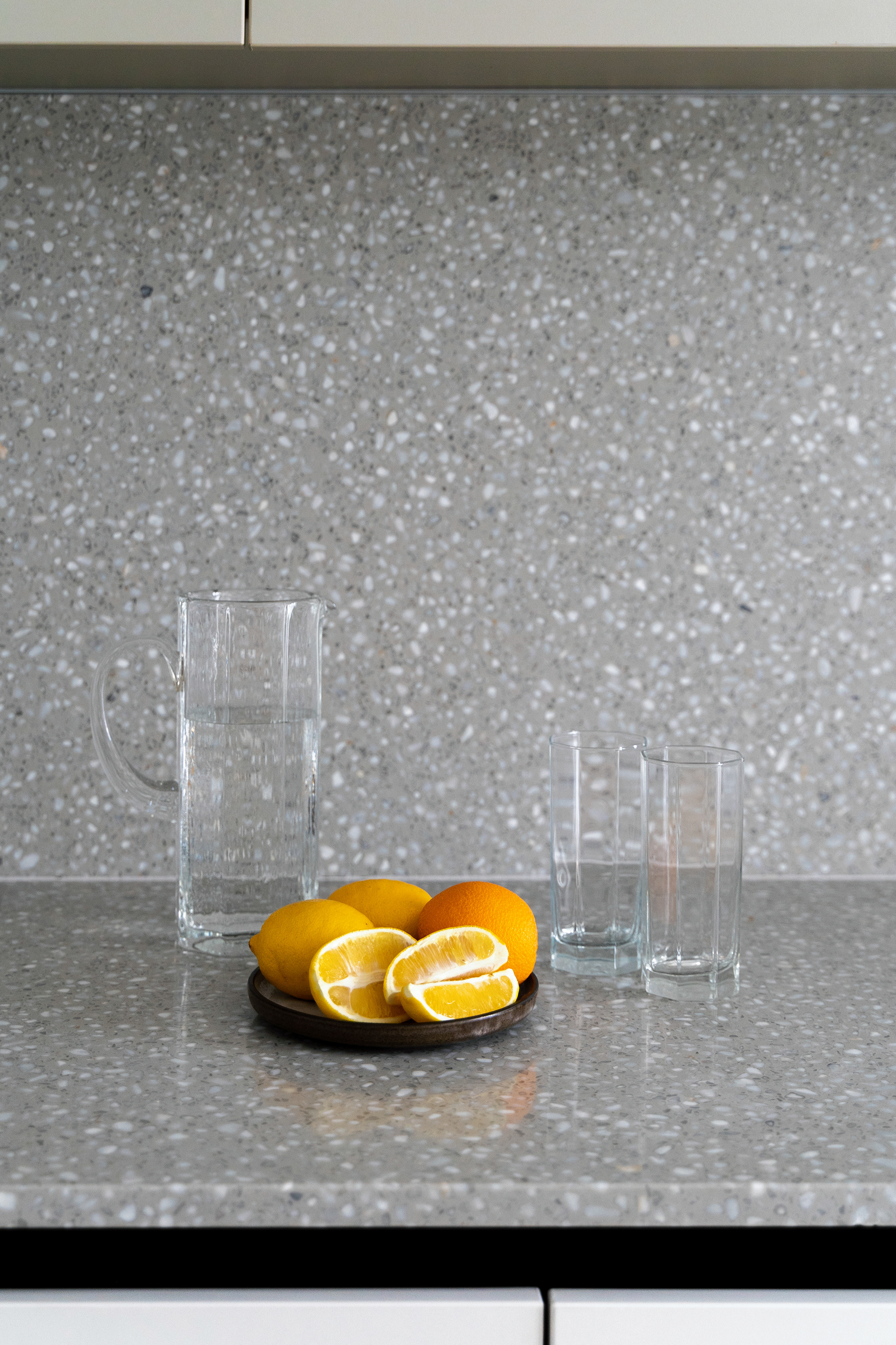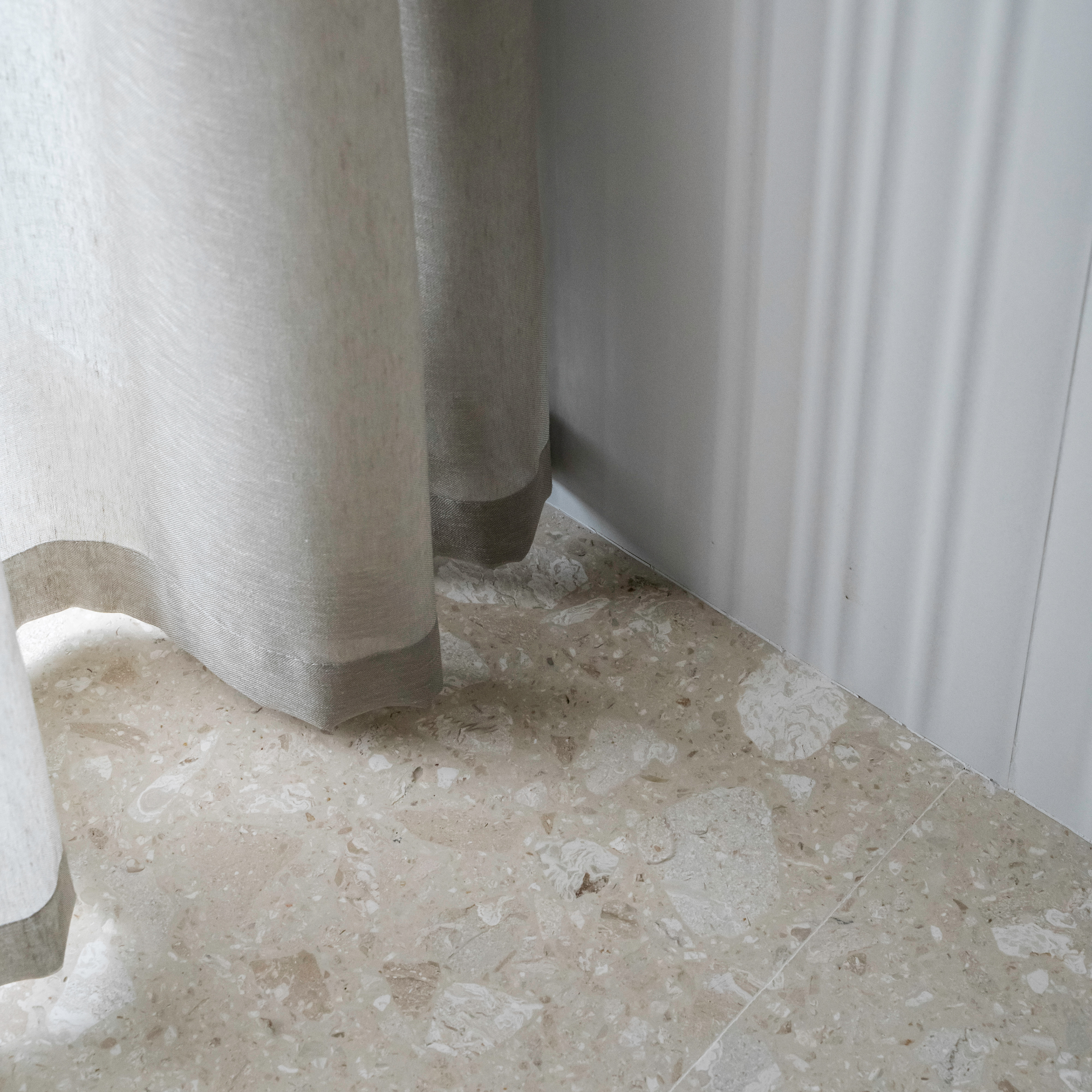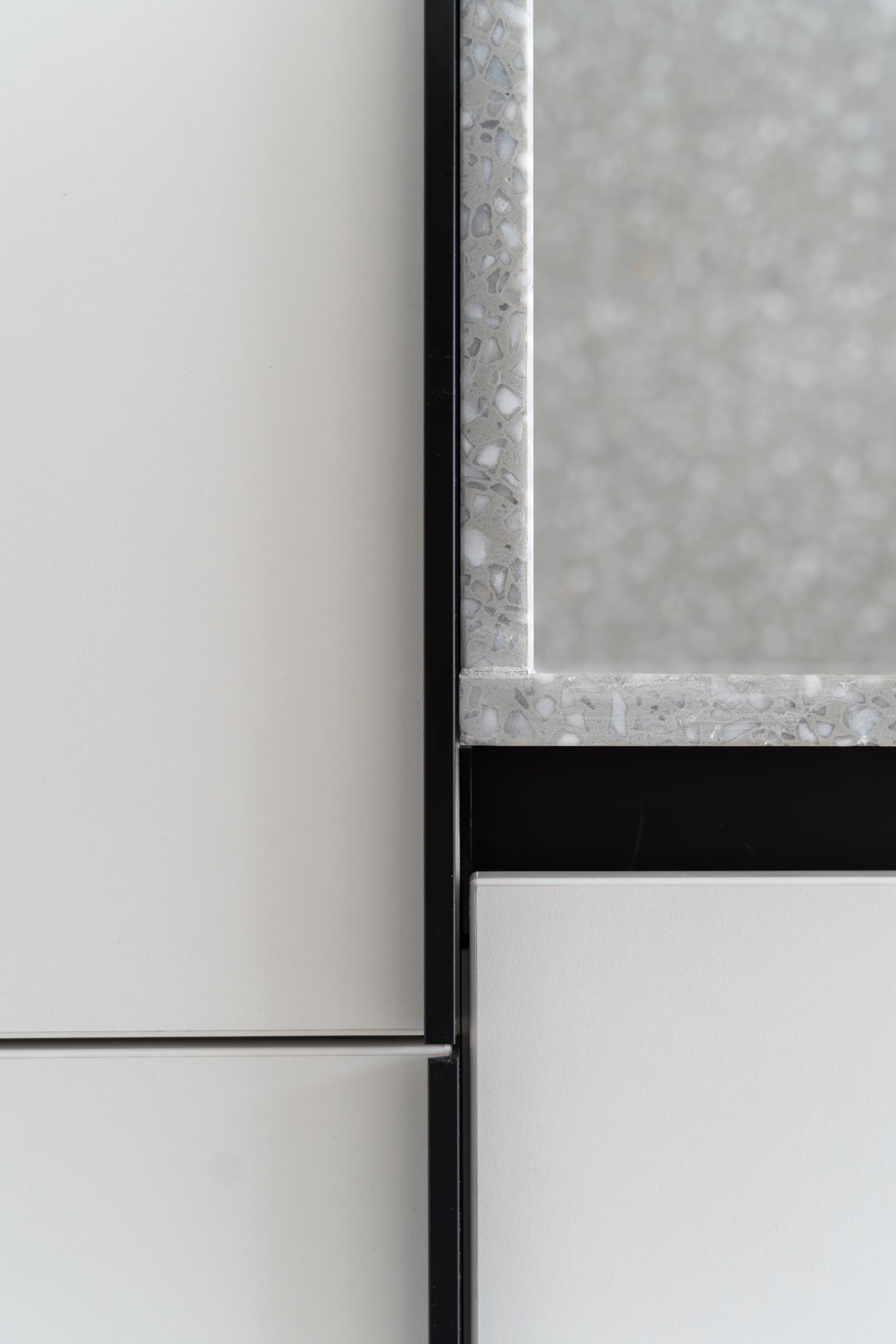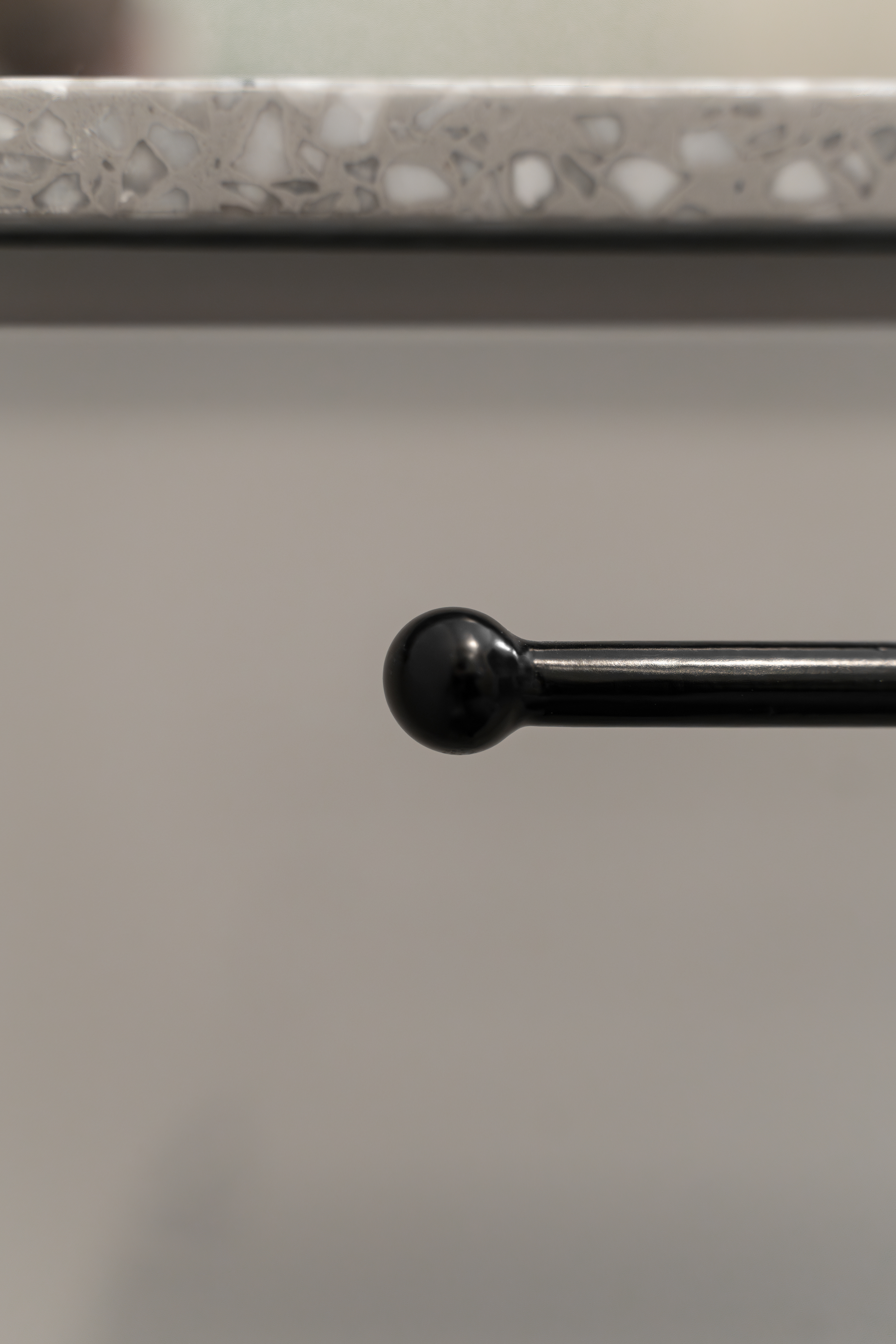 Closely related to simplicity and "as little as possible", the two-room apartment serves a young person who sometimes works from home. Limiting ourselves to the strict necessities, we came to this final proposal which not only visually hides each and every existing storage area, but also chooses to subtly mark this minimum need for living. On the one hand, we have a day-living area that, instead of "hiding" and limiting the working desk, positions it as part of the furniture open to the common space. On the other hand, we have the transition from the day area to the night area which we chose to mark with a so-called "portal". Once covered with veneer, this transition becomes much more intimate, with a particular nuance. In addition to the walls cladding, there is also the mirror that brings a necessary depth to a small space - like this hallway - and has an important functional role. The color and texture of the chosen materials, whether in the kitchen and living-room or in the bedroom or bathroom, define the spaces and allow us to notice the different elements of the project, whether they are structural, functional or purely ornamental.