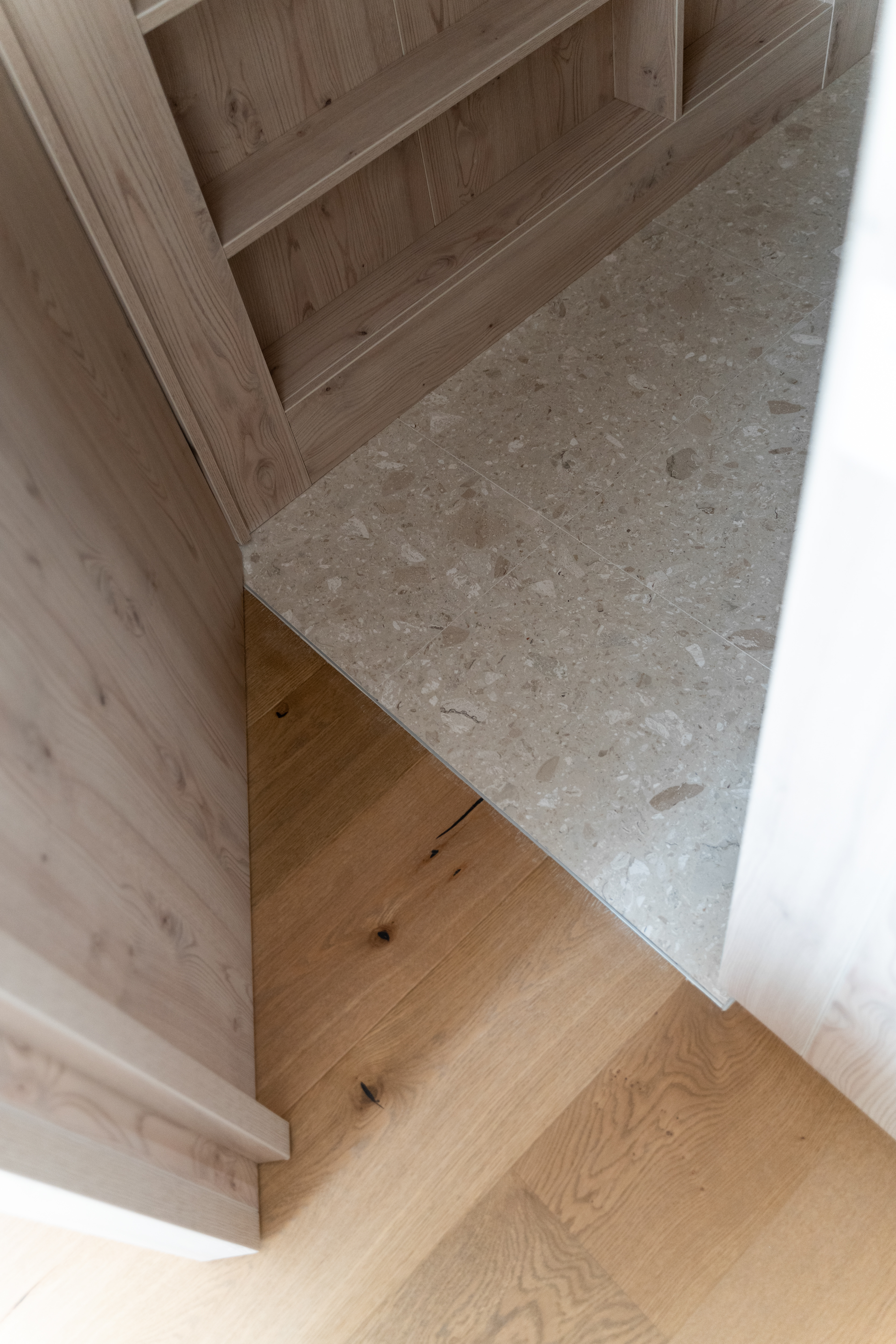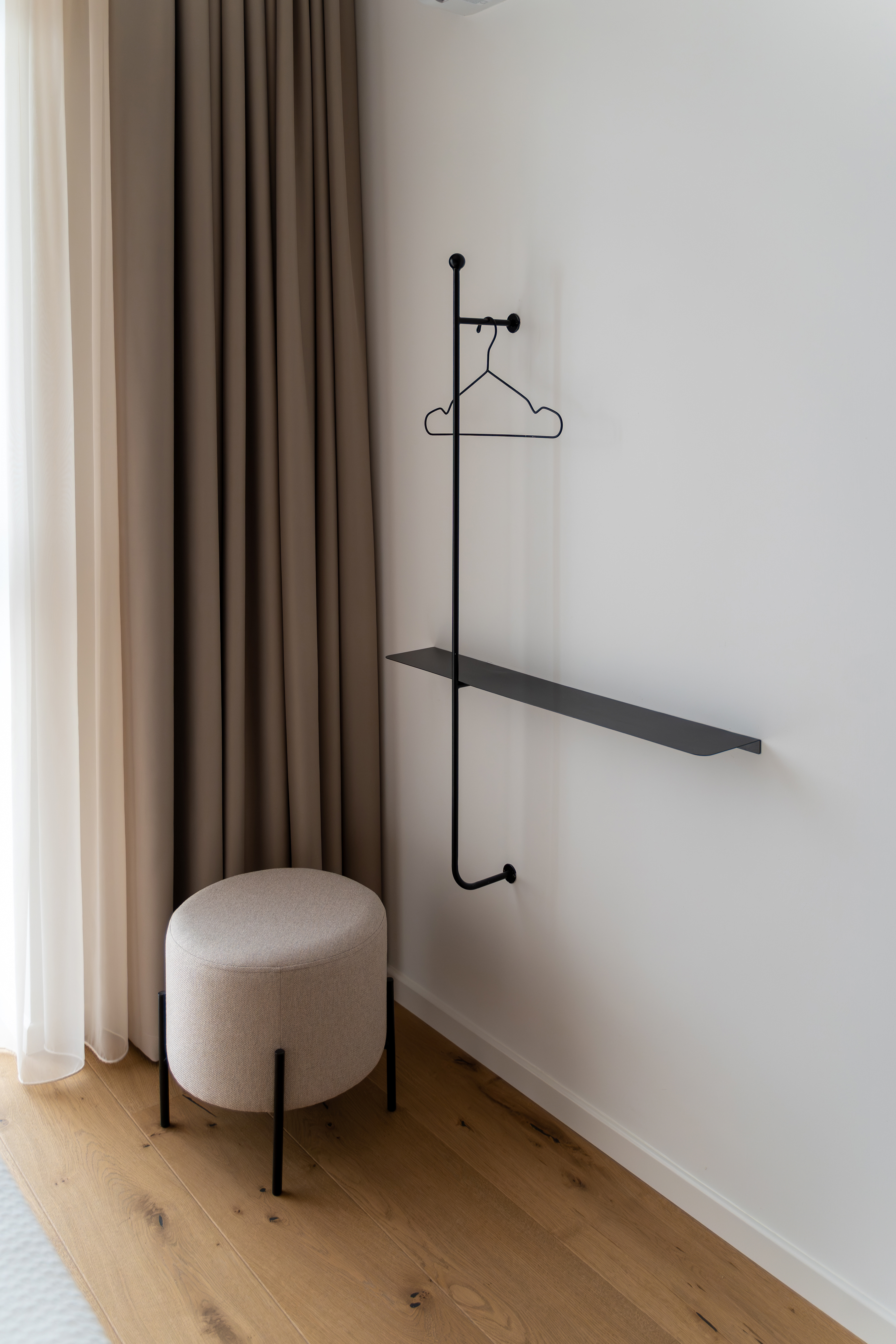 The project solution came very naturally, intuitively, letting the important details of the beneficiary's routine outline the space. Connecting the spaces as well as possible, the change from the access level to the bedroom was a necessary one. This led to a very clean and linear resolution of the space in the bedroom, gaining a new functional area - slightly hidden - for the intermediate hall, between the rooms.